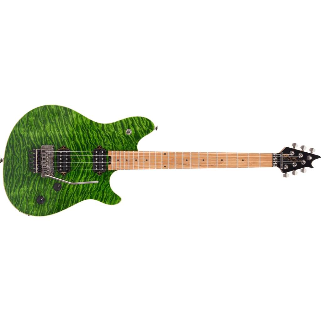 Les doubles micros EVH® Wolfgang humbucker montés directement sur le corps augmentent le transfert des vibrations, ce qui permet de les maintenir pendant plusieurs jours. Deux boutons de contrôle noirs moletés ont été composés selon les spécifications rigoureuses de Van Halen : les pots de 500k au toucher doux permettent de trouver facilement un son unique tout en conservant l'éclat haut de gamme des micros Wolfgang. Le chevalet Floyd Rose® Special de la marque EVH et l'écrou de blocage R2 maintiennent l'instrument en parfait accord même lors des plongées les plus profondes et des hennissements de chevaux.