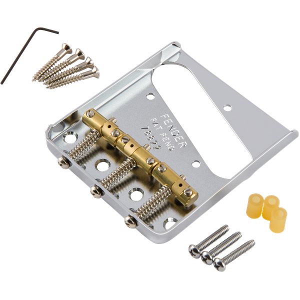 Chevalet en acier plaqué (non sérialisé). La plaque de chevalet est estampillée « Fender Pat. Pend. 77038 ». L'ensemble comprend trois pontets en laiton compensés intonables de style vintage, des vis de hauteur de chevalet à tête fendue, des vis d'intonation à tête Philips, des ressorts d'intonation et quatre vis de montage de chevalet à tête fendue de style vintage. L'ensemble comprend également une clé de réglage de la hauteur du chevalet. Les embouts de cordes sont vendus séparément.