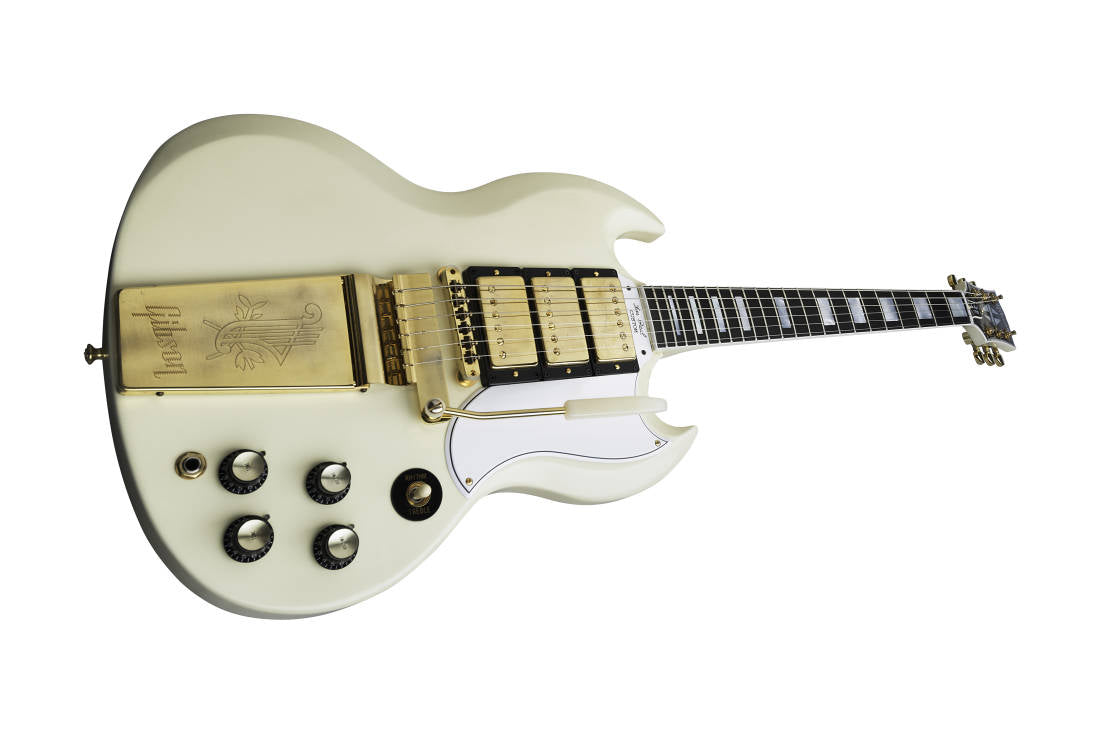 La dernière année de l'appellation "Les Paul" sur la SG Custom fut également la première année de la Maestro Vibrola... 1963. Gibson Custom Shop a fièrement recréé cette version désirable de la SG Custom jusqu'aux méthodes de construction et aux contours originaux. Le résultat est un instrument magnifique, polyvalent et d'une sonorité extraordinaire qui se joue sans effort. La touche en ébène massif et l'électronique de style vintage remaniée lui permettent d'atteindre de nouveaux sommets sonores en termes de clarté et de sustain. Des dimensions aux contours, en passant par les motifs d'incrustation précis et l'expérience sonore, c'est le haut de gamme de la SG à tous égards !