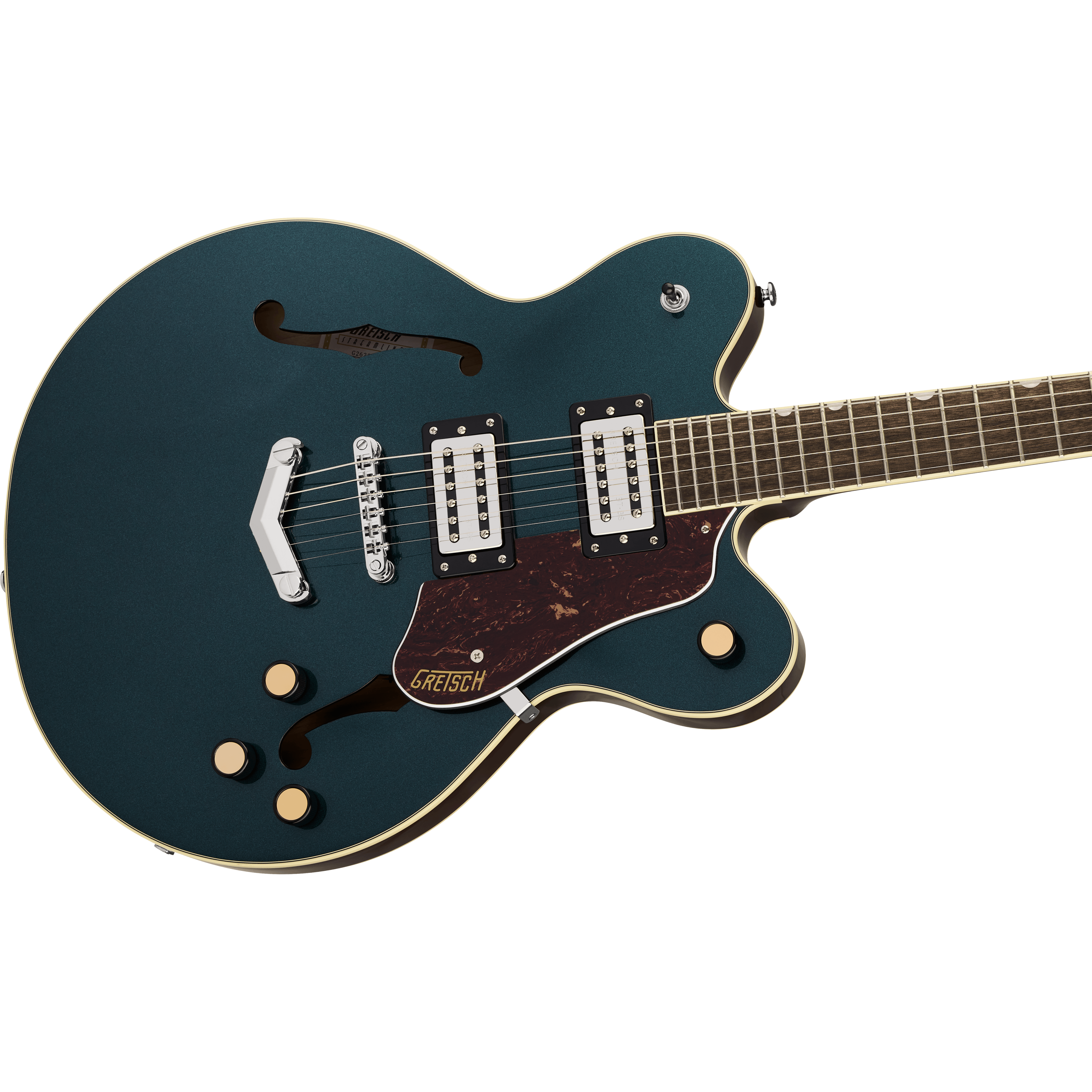 La G2622 Streamliner Center Block Double-Cut avec V-Stoptail fait irruption dans l'ère moderne avec un son puissant et un style élégant. L'élégante G2622 est conçue pour le guitariste qui exige plus que le banal d'un instrument : plus de performances, plus de style et, surtout, plus de volume, tout en conservant tout ce que l'on attend d'une Gretsch.