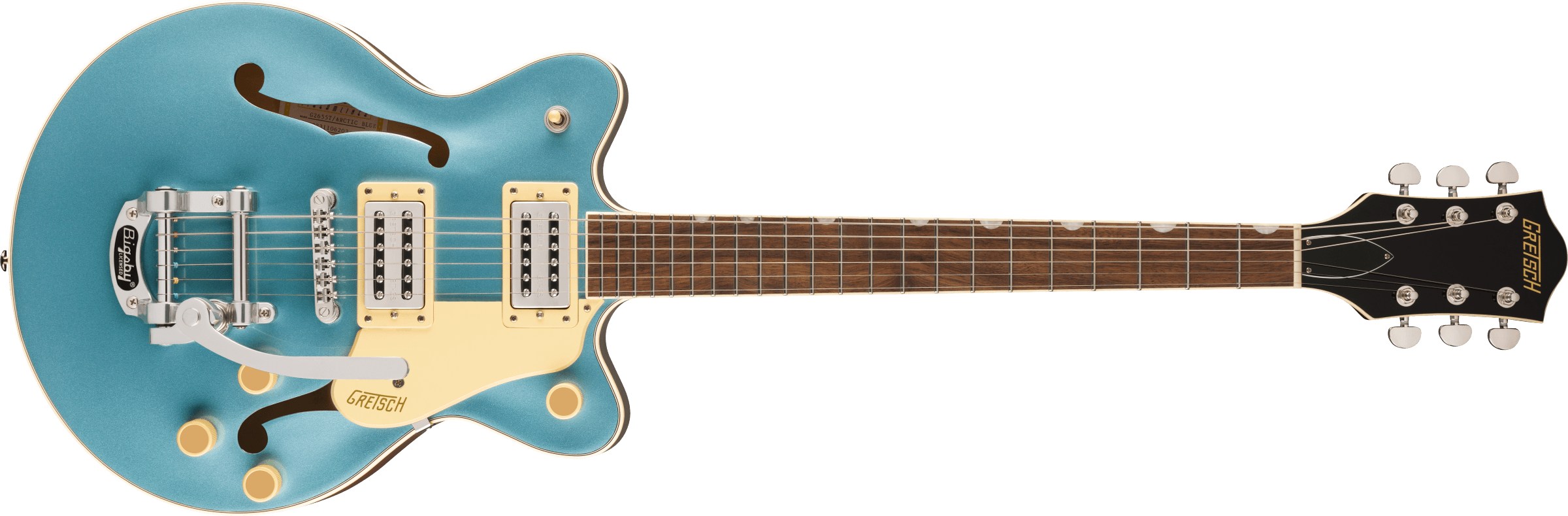La G2655T Streamliner⢠Center Block Jr. Double-Cut avec Bigsby® fait irruption dans l'ère moderne avec un son puissant et un style dans un emballage plus petit. L'élégante G2655T est conçue pour le guitariste qui exige plus que le banal d'un instrument - plus de performance, plus de style et surtout, plus de volume - tout en conservant tout ce que vous attendez d'une Gretsch.