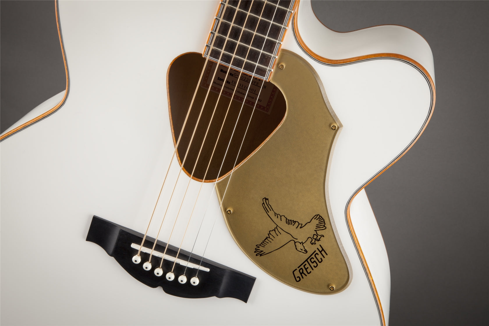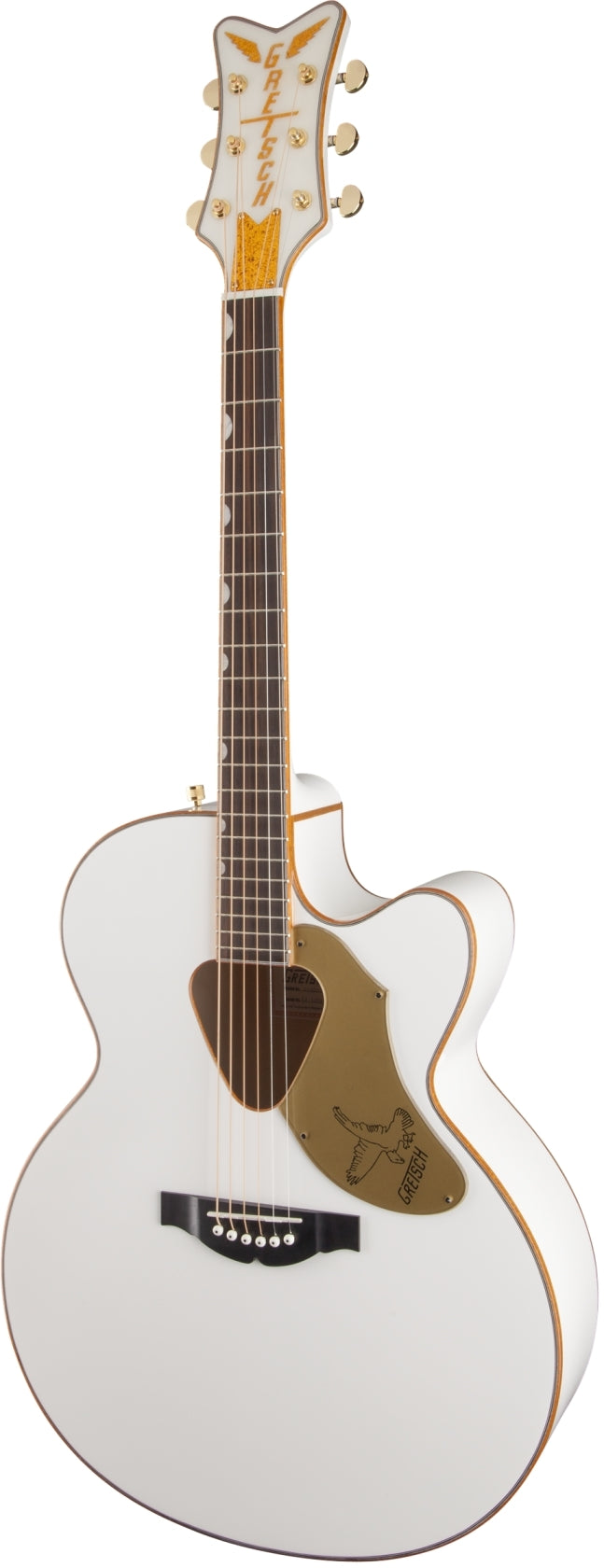 Son corps jumbo cutaway comprend d'éblouissantes reliures dorées scintillantes sur le dessus, le dos, la rosace, la touche et la tête. Parmi les autres caractéristiques haut de gamme, citons une table en épicéa massif avec entretoises en "X" festonnées et rosace triangulaire classique Rancher, des côtés et un dos arqués en érable, un manche en acajou, une touche 21 frettes en palissandre avec incrustations en forme d'ongle Neo-Classic™, une tête en forme de "V" avec logo étincelant "Gretsch" ailé vertical, un chevalet compensé avec base en palissandre, des accordeurs de luxe et une quincaillerie plaquée or.