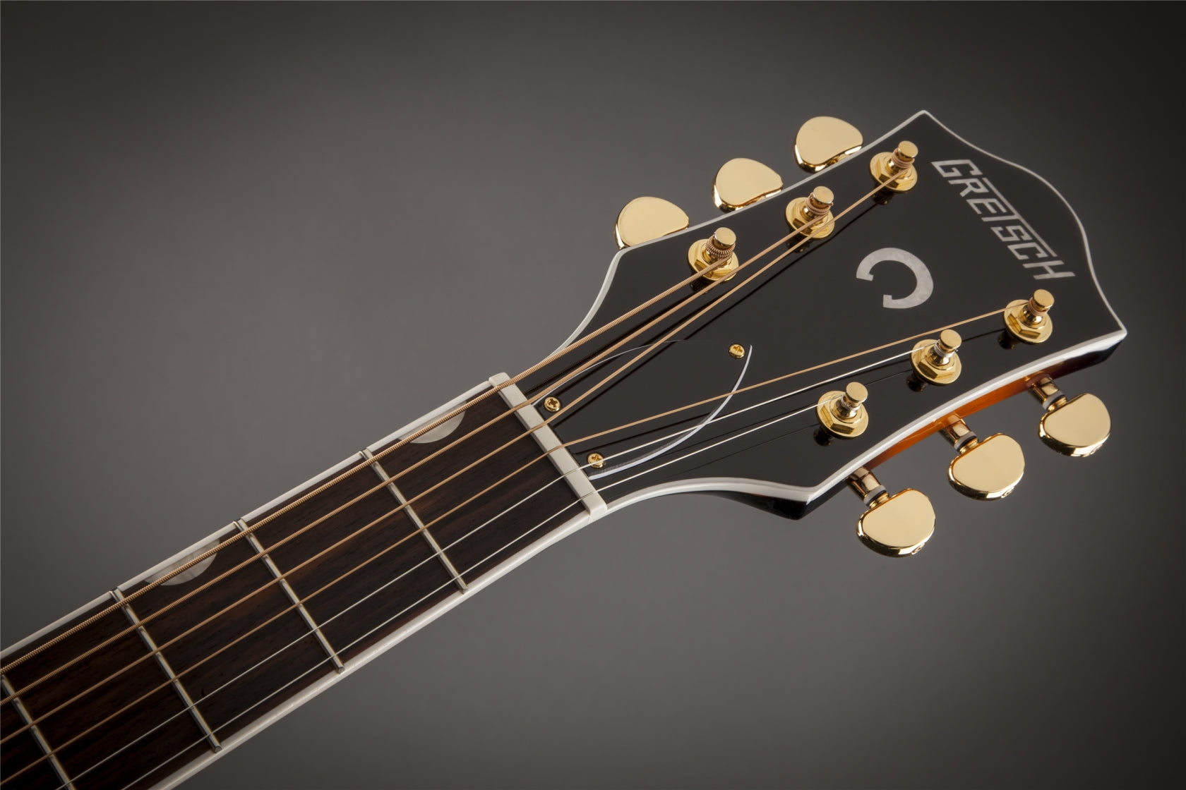 Les autres caractéristiques haut de gamme comprennent une table d'harmonie en épicéa massif lié avec un entretoisement festonné en "X" et l'orifice d'écoute triangulaire lié classique de la Rancher, des côtés en érable flammé et un dos arqué lié, un manche en acajou, une touche en palissandre à 16 frettes avec incrustations en forme d'ongle Neo-Classic™, un contrôle de volume, un sillet de chevalet compensé avec base en palissandre, des accordeurs de luxe et une quincaillerie plaquée or.