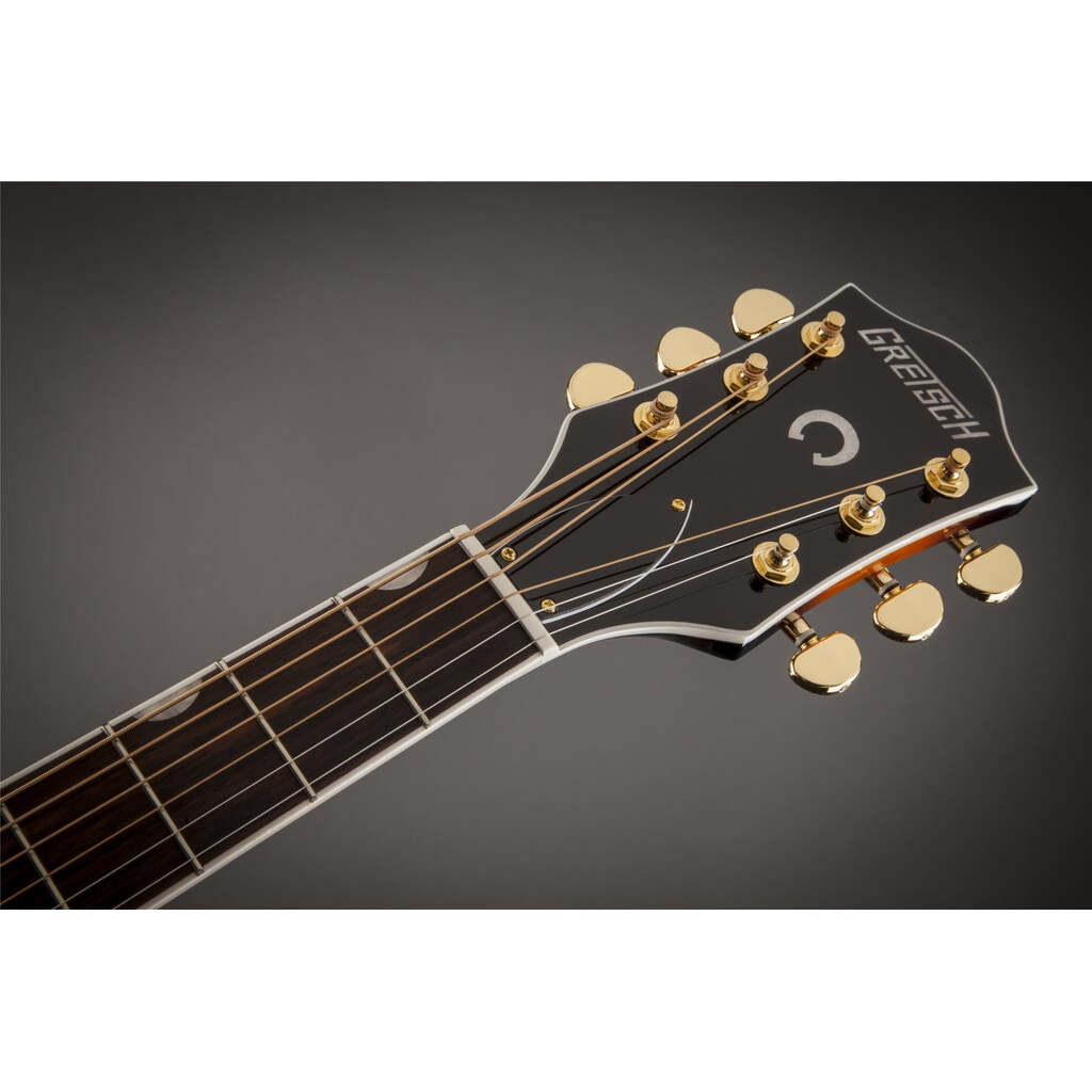 Les autres caractéristiques haut de gamme comprennent une table d'harmonie en épicéa massif lié avec un entretoisement festonné en "X" et l'orifice d'écoute triangulaire lié classique de la Rancher, des côtés en érable flammé et un dos arqué lié, un manche en acajou, une touche en palissandre à 16 frettes avec incrustations en forme d'ongle Neo-Classic™, un contrôle de volume, un sillet de chevalet compensé avec base en palissandre, des accordeurs de luxe et une quincaillerie plaquée or.