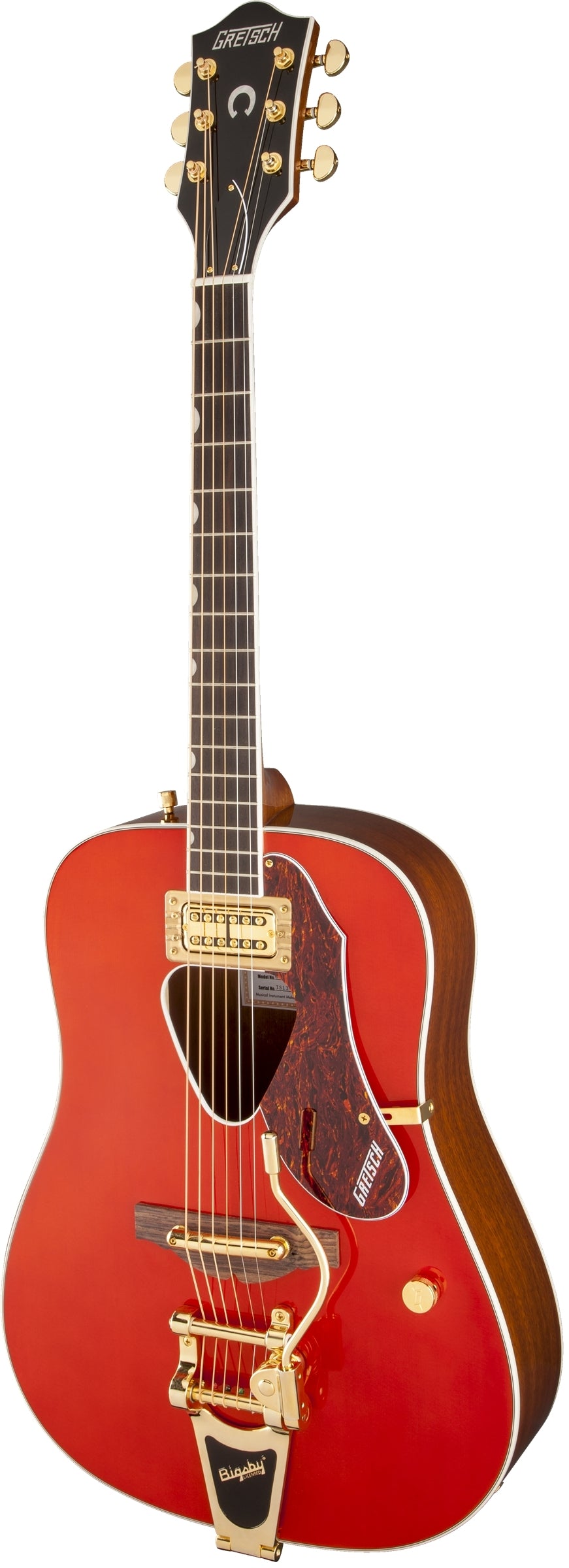 Les autres caractéristiques haut de gamme comprennent une table d'harmonie en épicéa stratifié, un dos arqué en acajou stratifié, des côtés en acajou stratifié, un trou d'écoute triangulaire lié classiquement à la Rancher, un manche en acajou, une touche en palissandre à 16 frettes avec incrustations en forme d'ongle Neo-Classic™, un contrôle de volume, un pont à barre oscillante avec base en palissandre, des mécaniques de luxe et des ferrures plaquées or.