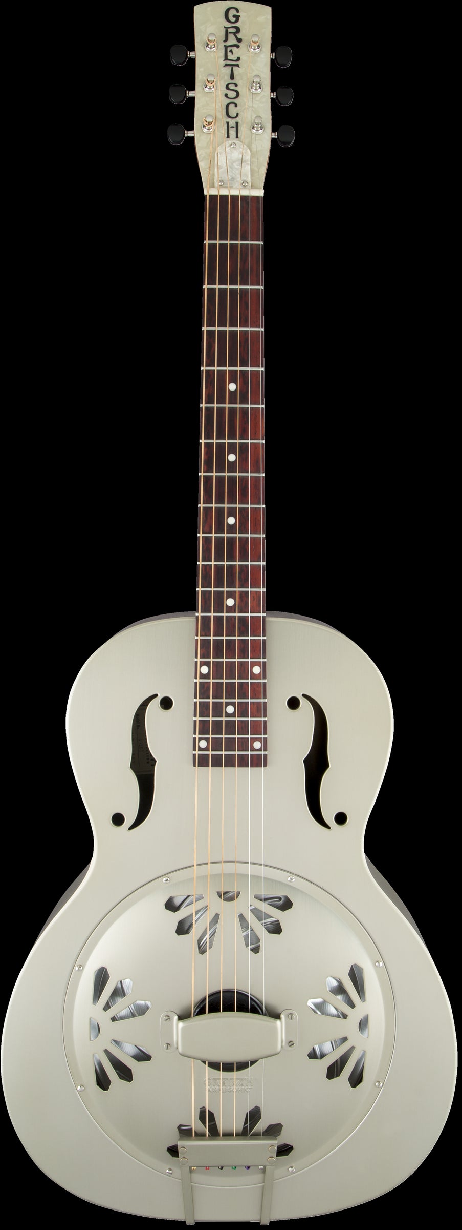 Caractéristiques uniques{"en":"Bell Brass Body; Gretsch Ampli-Sonic™ Biscuit Resonator Cone and Bridge; Poinsettia Design Cover-Plate; Weathered \"Pump House Roof\"" Body Finish; 1930s Gretsch Headstock with Aged Pearloid Face.""}