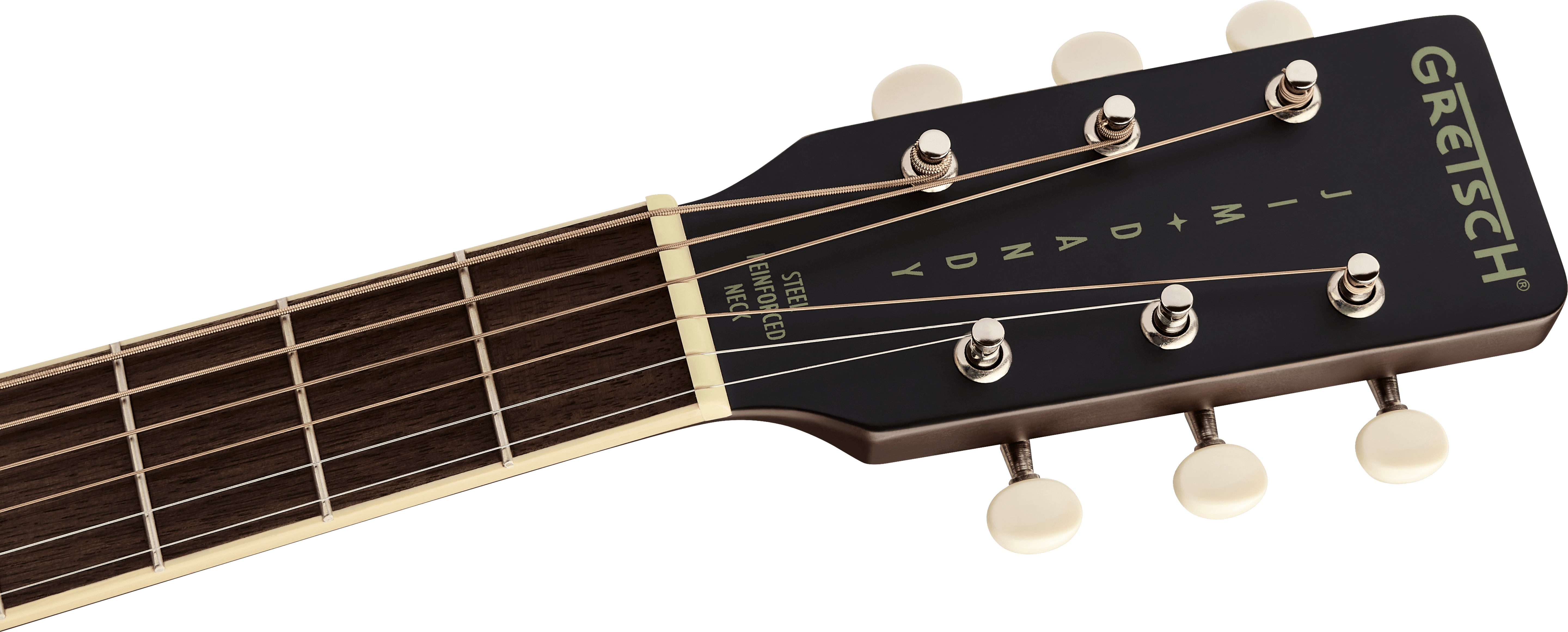 Le corps à barrage en X est fabriqué avec des bois stratifiés légers sélectionnés pour un équilibre optimal entre sonorité vintage et durabilité fiable, tandis que le manche en « C » offre une sensation invitante pour des heures d'inspiration rétro. Des détails d'époque, tels qu'un chevalet à goupilles de style vintage, une plaque de protection à motif « G », des filets à rayures peintes, des mécaniques à engrenages ouverts 3 sur plaque et des incrustations de touche à points surdimensionnés, lui confèrent une personnalité nostalgique idéale pour tous les festivals et fêtes.