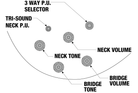 - Lorsque le sélecteur de micro est en position manche, le micro du manche est sélectionné. Lorsque le sélecteur est en position centrale, les micros du manche et du chevalet sont sélectionnés. Lorsque le sélecteur est en position chevalet, le micro du chevalet est sélectionné. Si le commutateur « Tri-Sound » du manche est en position manche, le micro du manche est en mode parallèle. Si le commutateur est en position centrale, le côté manche du micro du manche est sélectionné. Si le commutateur est en position chevalet, le micro du manche est en mode série.