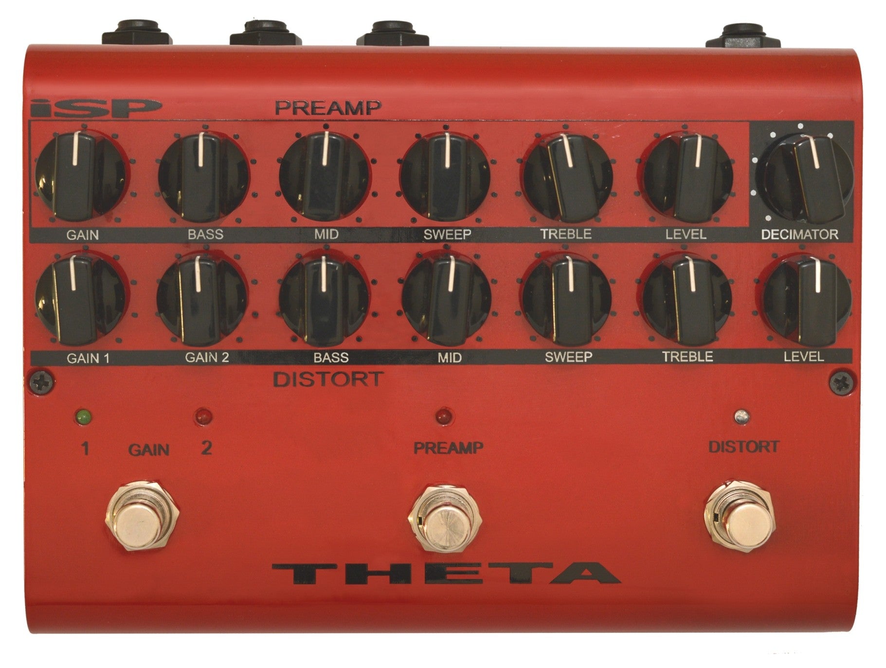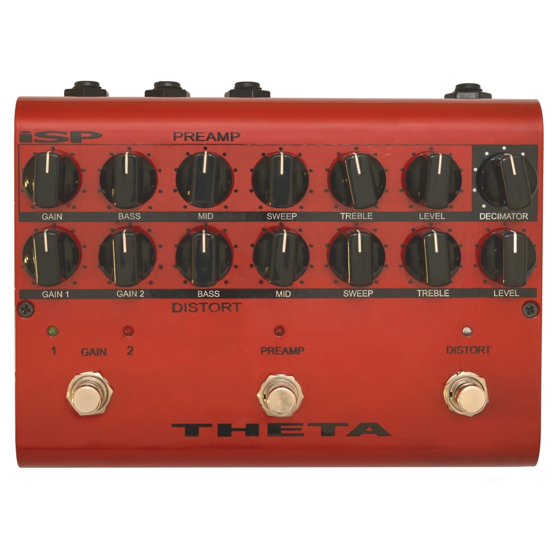 La pédale ISP Technologies THETA PREAMP comprend la section 'High Gain' de l'amplificateur THETA et le préampli THETA Rack-mount dans une pédale. La pédale THETA PREAMP comprend un préampli pre-Distort, THETA High Gain Distortion, et le circuit du Decimator G-string II pour la réduction de bruit. La section préamplificateur est doté de commandes de "Gain","Bass","Midrange boost" / "Cut Level" et "Midrange Sweep de 300 à 3KHz","Treble" et "Preamp level".