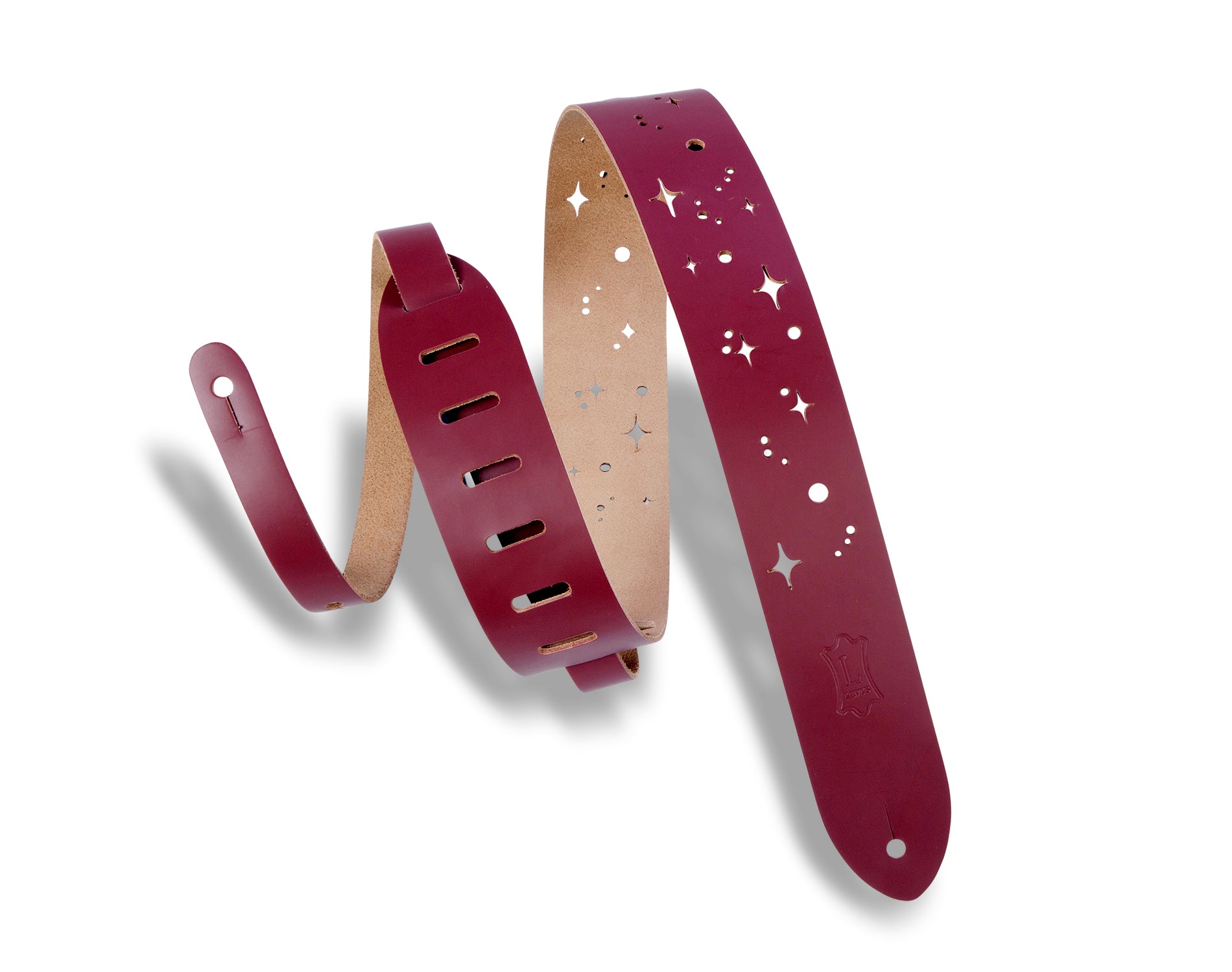One-ply chrome-tan leather guitar strap with galaxy punch out pattern.