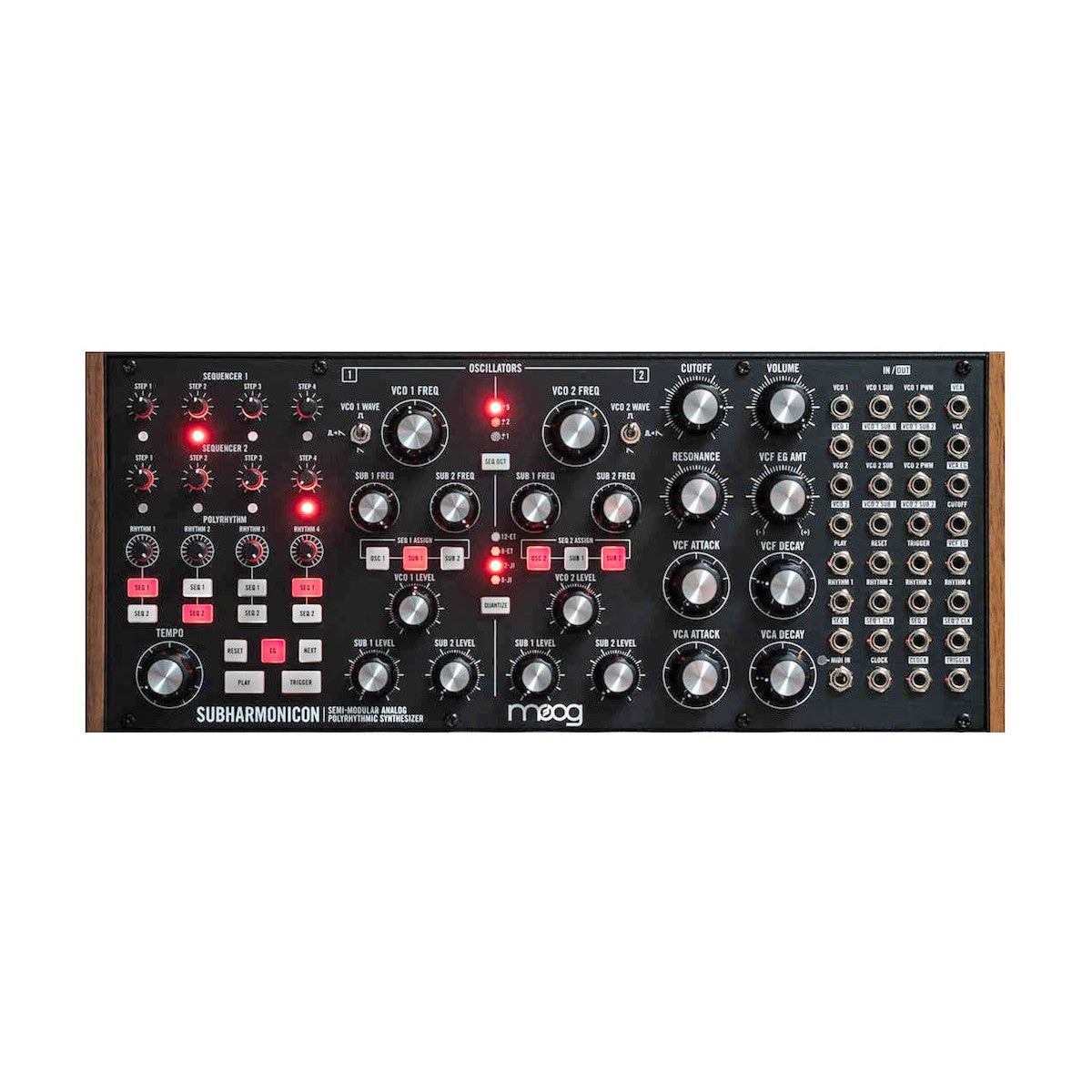 L'animation des formes d'accords caractéristiques de Subharmonicon se fait par le biais d'une paire polyrythmique de séquenceurs à 4 niveaux. Chaque séquenceur est synchronisé par l'un ou l'autre des quatre générateurs de rythme qui produisent des divisions mathématiques du tempo principal. Superposez plusieurs générateurs de rythme pour créer des polyrythmies complexes et découvrir de nouveaux modèles et styles inspirants. Plongez dans les générateurs à double enveloppe, le filtre Moog Ladder et le VCA analogique de Subharmonicon pour faire apparaître des articulations dynamiques allant des pads luxuriants et des bords flous aux plosives percussives et aux rythmes ritualistes.