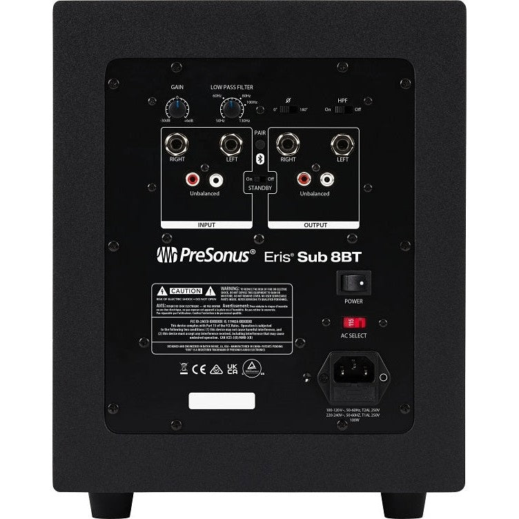 - The first PreSonus® studio subwoofer to offer Bluetooth® 5.0 wireless connectivity, the Eris Sub 8BT provides flexible wired connection options, as well, making it easy to add it to just about any monitoring setup. Onboard controls let you effortlessly create a 2.1 monitoring system and tune it to your room. High-pass filter and low-pass filter (crossover) controls ensure the Eris Sub 8BT starts working at the precise frequency where your main monitors stop, avoiding the flabby, smudged, low-end mess that occurs without a crossover.