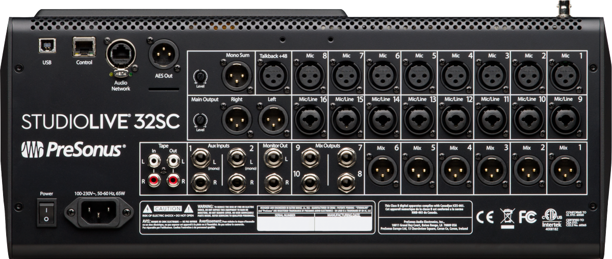 La StudioLive®Â 32SC est une console de mixage numérique compacte à 32 canaux, montable en rack, qui peut être facilement adaptée à des applications nécessitant 16, 24 et 32 canaux. Autour d'un moteur DSP FLEX PreSonus® à double cŠur, vous disposez de 40 canaux de mixage, 26 bus de mixage et 286 processeurs simultanés, dont 4 unités d'effets stéréo et des modélisations sous forme de plug-in pour Fat Channel sur chaque canal d'entrée et bus de mixage. Avec 128 (64x64) canaux d'enregistrement par USB et d'entrées/sorties audio sur réseau AVB, des options de routage flexibles et un son de qualité studio, la StudioLive 32SC vous apporte tous les outils dont vous avez besoin, que ce soit pour construire le studio de vos rêves ou pour monter une configuration professionnelle de tournée.