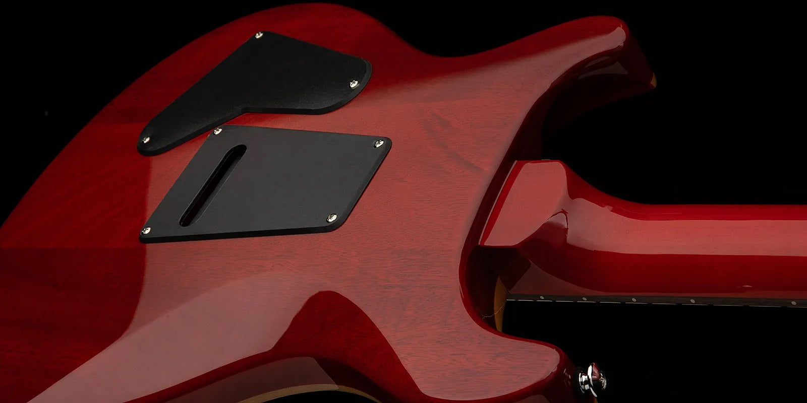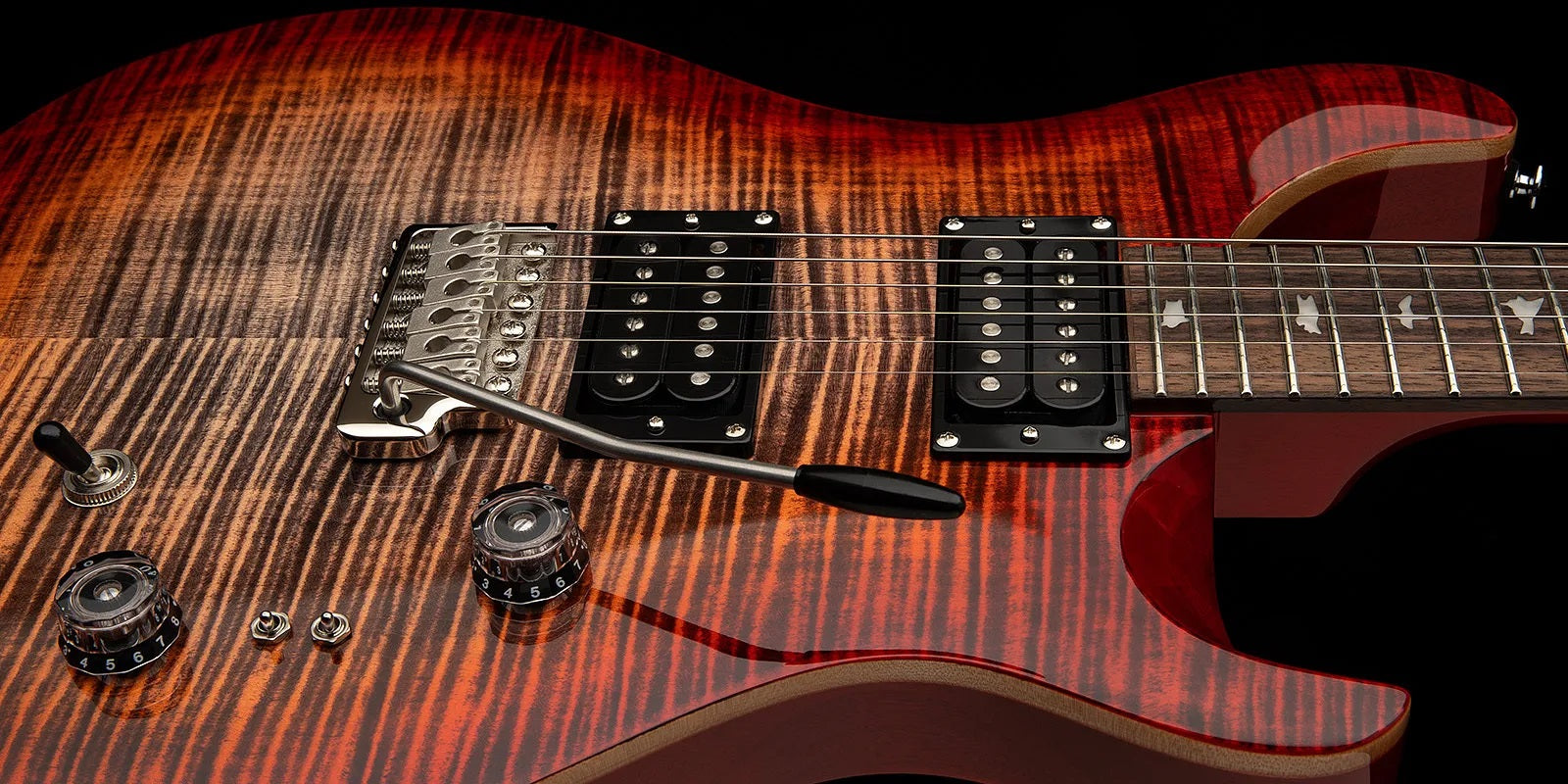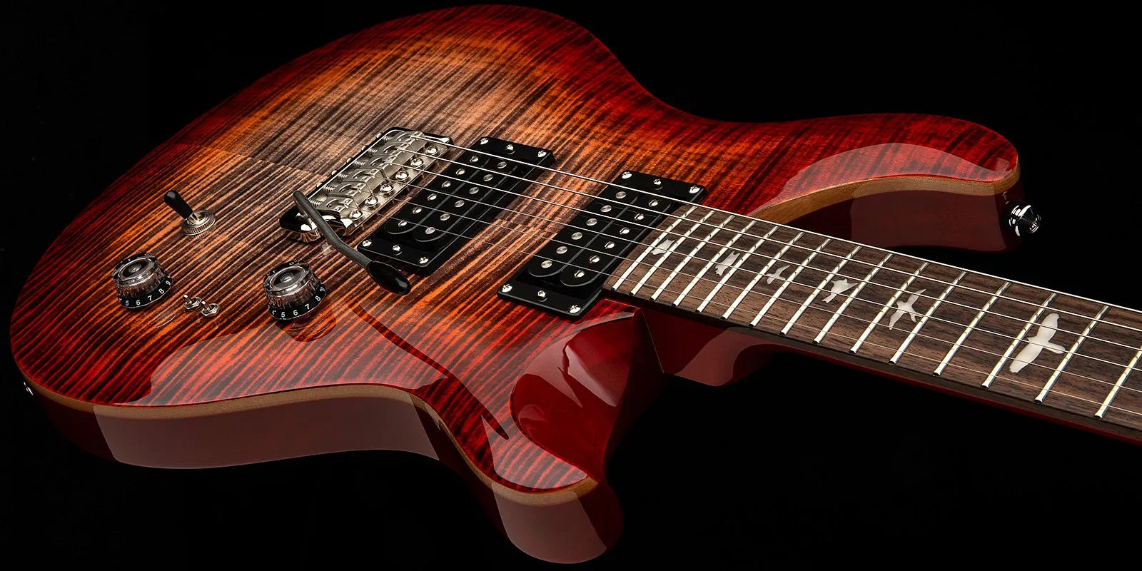 - Les éléments de conception classiques comprennent une table en érable, un dos en acajou, une touche en palissandre, 24 frettes, une longueur d'échelle de 25 po, des incrustations d'oiseaux, 2 humbuckers, un logo de signature sur la poupée et un trémolo breveté de PRS.