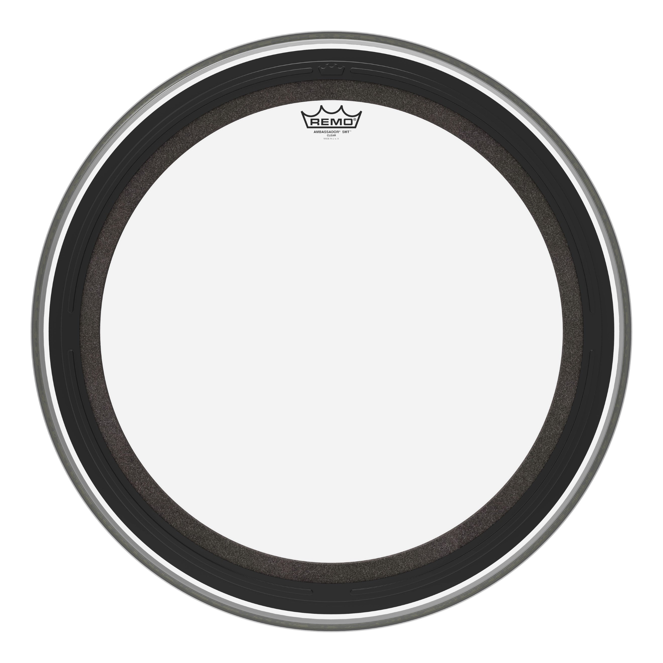 The Ambassador® SMT™ Clear bass drumhead is a pre-muffled design featuring Sub Muffl® Technology. It is constructed with a clear 10-mil single-ply film, and an externally mounted dampening profile with free-floating acoustic foam. It enables the head and drum shell to maintain full sound characteristics with additional attack and low-end frequencies. SMT technology allows a broad tonal spectrum of tuning ranges with controlled high and mid frequencies coupled with deep, powerful low tones. It is a new industry standard and one of the market's most musical and versatile pre-muffled bass drumheads. Ideal for live and recording applications.