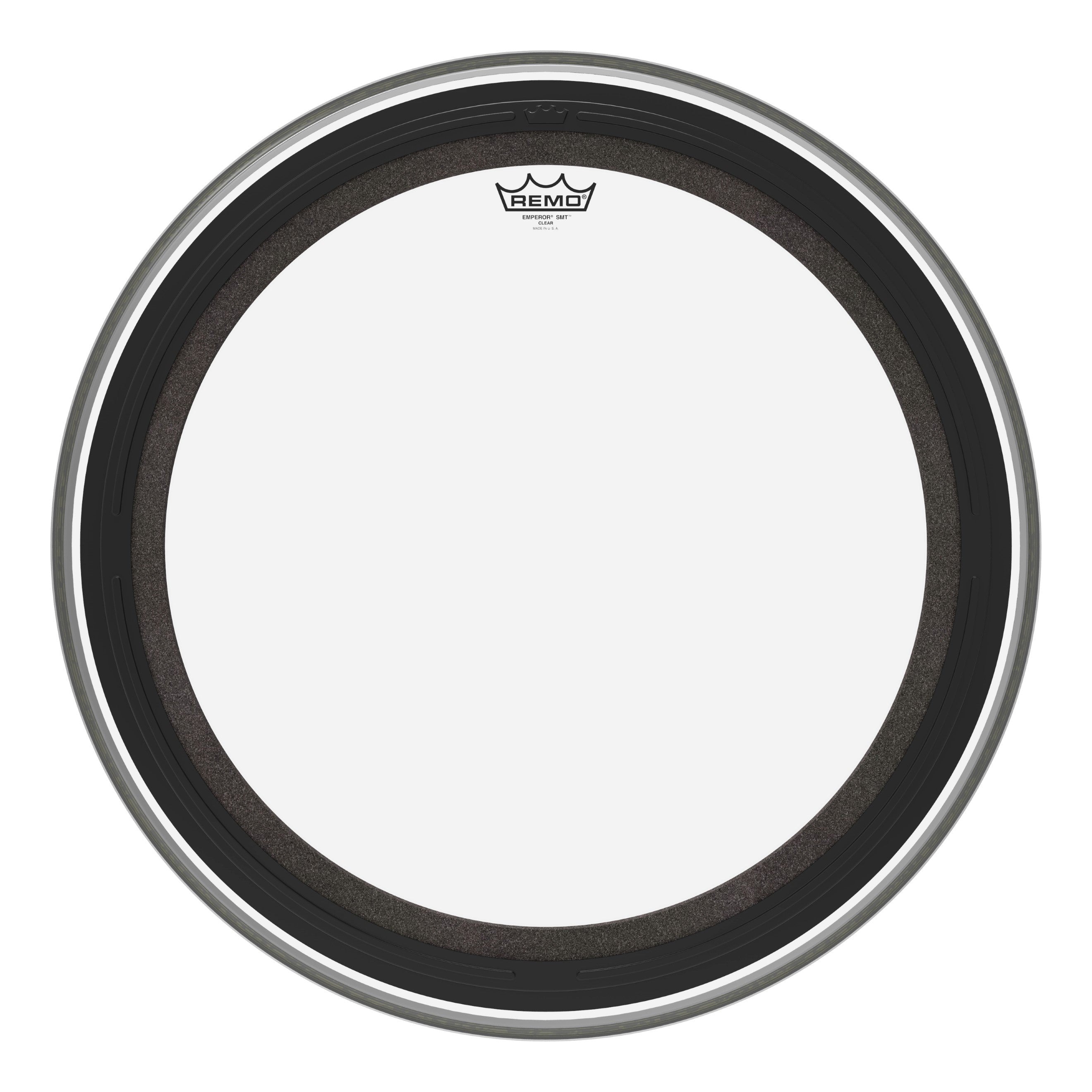 The Emperor® SMT™ Clear bass drumhead is a pre-muffled design featuring Sub Muffl® Technology. It is constructed with 2-plies of 7-mil and 5-mil clear film, and an externally mounted dampening profile with free-floating acoustic foam. It enables the head and drum shell to maintain full sound characteristics with additional attack and low-end frequencies. SMT technology allows a broad tonal spectrum of tuning ranges with controlled high and mid frequencies coupled with deep, powerful low tones. It is a new industry standard and one of the market's most musical and versatile pre-muffled bass drumheads. Ideal for live and recording applications.