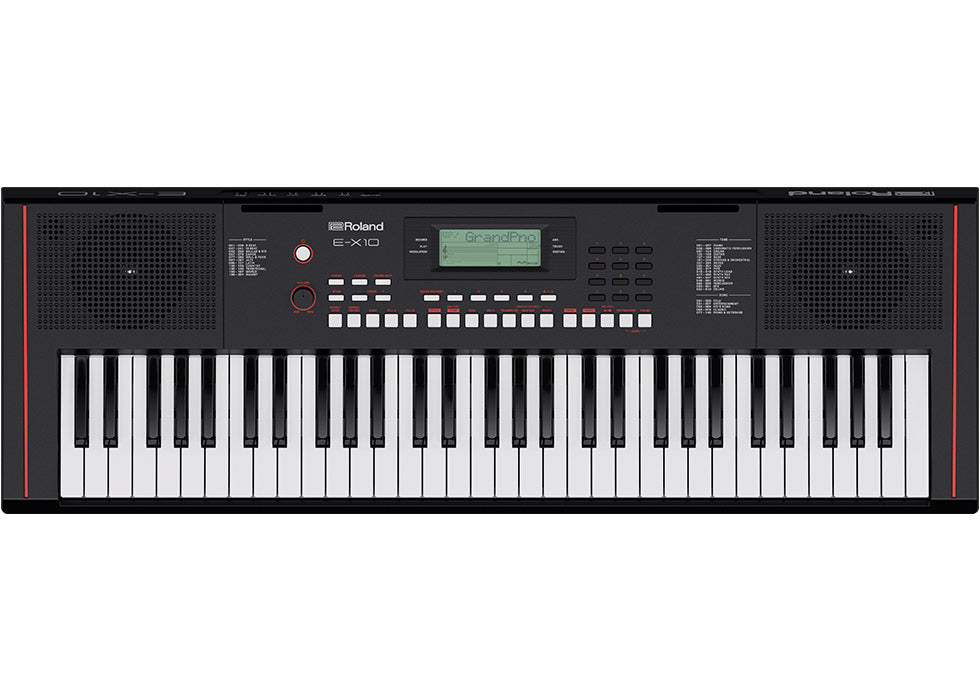 Launch your musical journey with the E-X10, an inspiring starter keyboard with quality features derived from professional Roland instruments. Have fun as you learn with expressive acoustic pianos and hundreds of other sounds. Command a full band with auto-accompaniment and connect a mic to sing along. Record keyboard performances to check your progress. And play anywhere with the sleek portable design, onboard stereo speaker system, and support for battery-powered operation.