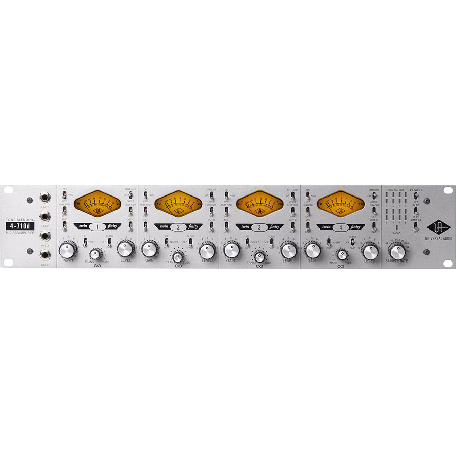 Au cœur du 4-710d, vous trouverez quatre canaux avec préamplificateurs micro “Twin-Finity” (avec circuit Tone-Blending) avec véritable bypass, compression de type 1176 (avec deux réglages spéciaux ''Fast'' et ''Slow''). Chacun des quatre préamplis micro offre un réglage variable exempt de toute distorsion de phase, vous permettant d’obtenir un son 100 % à lampes ou 100 % à semi-conducteurs. Vous disposez également de Jacks Send et Return vous permettant de connecter vos processeurs externes, ou pour l’accès direct au signal.