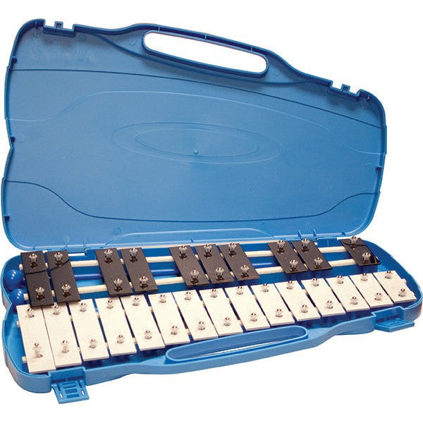 Glockenspiel plaqué argent de 25 notes (sol2-sol4), accordé pour une hauteur et des intervalles précis. Livré prêt à jouer avec deux baguettes de xylophone. Il est livré dans un robuste étui de transport en plastique bleu.