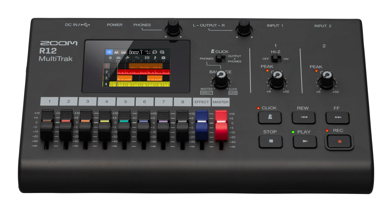 Le R12 comprend un canal d'effets de départ offrant réverbération, chorus et délai avec un fader de retour d'effets dédié. Pour des sonorités avancées, vous pouvez utiliser les presets et les effets du Guitar Lab de Zooms. Le R12 dispose également d'un panoramique et d'un égaliseur à 3 canaux pour chaque piste et d'un compresseur sur les entrées 1 et 2.