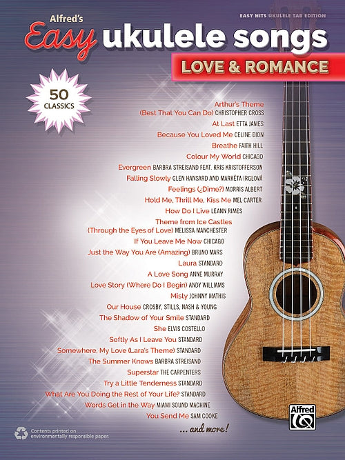 For beginning musicians, Alfred's Easy series is the fast track to developing a repertoire of well-known and fun-to-play songs, while more experienced players will find an excellent resource of favorite songs. The Easy Hits Ukulele format provides melody, chords, and lyrics for easy "strum and sing" performance---plus suggested strum patterns and TAB for any integral "hook" parts. This Love and Romance edition features songs from such artists as Celine Dion, Chicago, Bruno Mars, Andy Williams, Sam Cooke, Phil Collins, and many more! Titles: Against All Odds (Take a Look at Me Now) (Phil Collins) * Arthur's Theme (Best That You Can Do) (from Arthur) (Christopher Cross) * At Last (Etta James) * Because You Loved Me (Theme from Up Close and Personal) (Celine Dion) * Breathe (Faith Hill ) * Can You Read My Mind? (Love Theme from Superman) (Maureen McGovern) * Colour My World (Chicago) * Evergreen (Love Theme from A Star Is Born) (Barbra Streisand feat. Kris Kristofferson) * Falling Slowly (from Once) (Glen Hansard and Marketa Irglova) * Feelings (Dime?) (Morris Albert) * For Your Eyes Only (from For Your Eyes Only) (Sheena Easton) * Glory of Love (Theme from The Karate Kid Part II) (Peter Cetera) * The Greatest Love of All (Whitney Houston) * Hold Me, Thrill Me, Kiss Me (Mel Carter) * How Do I Live (LeAnn Rimes) * How Do You Keep the Music Playing? (from Best Friends) (Patti Austin and James Ingram) * (Everything I Do) I Do It for You (Bryan Adams) * I Swear (John Michael Montgomery) * Theme from Ice Castles (Through the Eyes of Love) (Melissa Manchester) * If You Leave Me Now (Chicago) * I'll Stand by You (The Pretenders) * I'm Not In Love (10cc) * It Might Be You (Theme from Tootsie) (Stephen Bishop) * Just the Way You Are (Amazing) (Bruno Mars) * Just You 'n' Me (Chicago) * Laura (Standard) * Look What You've Done to Me (Boz Scaggs) * Love Is a Many Splendored Thing (Standard) * A Love Song (Anne Murray) * Love Story (Where Do I Begin) (Andy Williams) * Misty (Johnny Mathis ) * Moonlight (Sting) * More Than You Know (Standard) * Nobody Does It Better (from The Spy Who Loved Me) (Carly Simon) * Open Arms (Journey) * Our House (Crosby, Stills, Nash and Young) * The Shadow of Your Smile (from The Sandpiper) (Standard) * She (Elvis Costello) * Softly, As I Leave You (Standard) * Somewhere, My Love (Lara's Theme) (from Doctor Zhivago) (Standard) * Stardust (Standard) * The Summer Knows (Theme from Summer of '42) (Barbra Streisand) * Superstar (The Carpenters) * The Sweetheart Tree (from The Great Race) (Henry Mancini) * Try a Little Tenderness (Standard) * What Are You Doing the Rest of Your Life? (Standard) * Words Get in the Way (Miami Sound Machine) * You Must Believe in Spring (Tony Bennett and Bill Evans) * You Send Me (Sam Cooke) * (For) Your Precious Love (Jerry Butler).