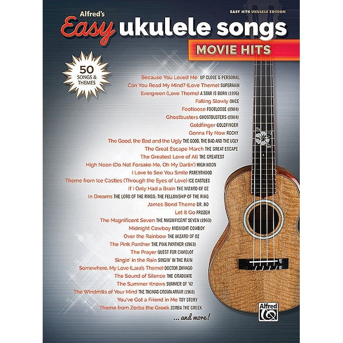 For beginning musicians, Alfred's Easy series is the fast track to developing a repertoire of well-known and fun-to-play songs, while more experienced players will find an excellent resource of favorite songs. The Easy Hits Ukulele format provides melody, chords, and lyrics for easy "strum and sing" performance---plus suggested strum patterns and TAB for any integral "hook" parts. This Movie Hits edition features popular songs and themes from the most timeless of films, such as "Over the Rainbow" from The Wizard of Oz, "Let It Go" from Frozen, "Ghostbusters" from the original 1984 movie, "I See Fire" from The Hobbit series, "Gonna Fly Now" from Rocky, and many more! Titles: Arthur's Theme (Best That You Can Do) (Arthur) * Because You Loved Me (Up Close and Personal) * Better Love (The Legend of Tarzan) * Can You Read My Mind? (Love Theme) (Superman) * Evergreen (Love Theme) (A Star Is Born, 1976) * Everything Is Awesome (Awesome Remixxx!!!) (The Lego Movie) * Falling Slowly (Once) * Footloose (Footloose) * For Your Eyes Only (For Your Eyes Only) * Ghostbusters (Ghostbusters, 1984) * Glory of Love (The Karate Kid Part II) * Goldfinger (Goldfinger) * Gonna Fly Now (Rocky) * The Good, the Bad and the Ugly (Main Title) (The Good, the Bad and the Ugly) * The Great Escape March (The Great Escape) * The Greatest Love of All (The Greatest) * High Noon (Do Not Forsake Me, Oh My Darlin') (High Noon) * (Everything I Do) I Do It for You (Robin Hood: Prince of Thieves) * I Don't Want to Miss a Thing (Armageddon) * I Love to See You Smile (Parenthood) * I See Fire (The Hobbit: The Desolation of Smaug) * Theme from Ice Castles (Through the Eyes of Love) (Ice Castles) * If I Only Had a Brain (The Wizard of Oz) * In Dreams (The Lord of the Rings: The Fellowship of the Ring) * Into the West (The Lord of the Rings: The Return of the King) * It Might Be You (Tootsie) * James Bond Theme (Dr. No) * Let It Go (Frozen) * The Magnificent Seven (The Magnificent Seven) * Mamma Mia (Mamma Mia!) * Midnight Cowboy (Midnight Cowboy) * Never on Sunday (Never on Sunday) * Theme from New York, New York (New York, New York) * Nobody Does It Better (The Spy Who Loved Me) * The Notebook (Main Title) (The Notebook) * Over the Rainbow (The Wizard of Oz) * Theme from Peyton Place (Peyton Place) * The Pink Panther (The Pink Panther) * The Prayer (Quest for Camelot) * Singin' in the Rain (Singin' in the Rain) * Somewhere, My Love (Lara's Theme) (Doctor Zhivago) * The Sound of Silence (The Graduate) * The Summer Knows (Summer of '42) * Talk to the Animals (Doctor Doolittle, 1967) * We Belong Together (Toy Story 3) * What Are You Doing the Rest of Your Life? (The Happy Ending) * What's New Pussycat? (Tom Jones!) * The Windmills of Your Mind (The Thomas Crown Affair) * You've Got a Friend in Me (Toy Story) * Theme from Zorba the Greek (Zorba the Greek).