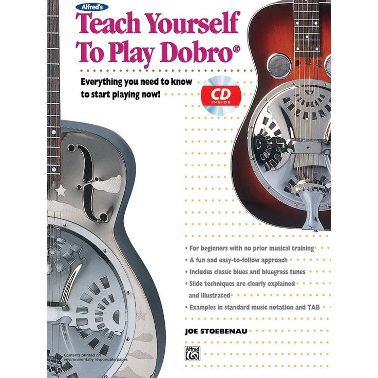 Created for beginners with no prior musical training, this book with CD starts out by explaining the parts of the instrument, its history, how it works, and how it's tuned. It continues by teaching alternate picking, rolls, and other right-hand techniques, along with slide techniques including bar slants, palm harmonics and cascade harmonics. Lots of classic tunes in authentic Dobro styles are included as well as step-by-step instructions and illustrations. Examples are provided in both standard music notation and TAB.