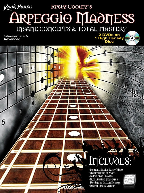 This book/high density DVD pack contains the most complete advanced collection of arpeggios ever! Rusty Cooley, one of the world's most technically advanced shredders, unveils the secret patterns, shapes and techniques that have propelled him to guitar greatness. Rusty begins with the 5 and 6 string shapes through melodic sequences and advances into additional concepts that expand your view of the guitar. Learn extended arpeggios, string skipping and legato techniques, single string triads, two string arpeggio sequences and diminished 7th arpeggios. Rusty goes where no other instructor has gone with intervallic 6 string shapes, complicated arpeggio phrases and his own song excerpts that are not for the weak hearted! A must have for all guitarists. Includes: portable device-ready video; over two hours of video; 80 pages of lessons; free lifetime membership for online lesson support; digital ebook version; and more!