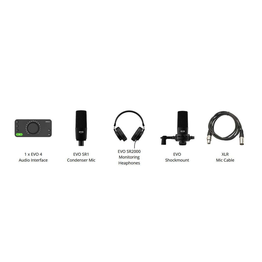 EVO4 Start Recording Bundled Audio Interface Innovation at the core Capture your microphones and instruments by recording audio directly to your computer with EVO 4’s intuitive feature set. Combining leading tech specs with astounding performance and sound quality, EVO 4 is the ultimate interface for beginners and pros alike. EVO Mic Preamps Building on Audient’s 20+ years of audio design experience, get unrivalled audio quality on your desktop with the clean, warm and accurate EVO preamps – offering 58dB of gain range. Smartgain Make sure you capture everything perfectly with Smartgain mode. Start playing, singing or talking and Smartgain will automatically set the level of your microphones. Perfect for beginners. Audio Loop-back Audio Loop-back enables you to record your computer audio at the same time as your microphones. Ideal for content creators, podcasters and streamers. Record your computers audio Record guest video calls Record gaming audio Easy to set up EVO 4 is USB 2.0 class compliant and works with both a USB-C and USB-A ports. USB-C to A Cable Included macOS Compatible Windows Compatible Compatible with iOS devices and without the need for external power, EVO 4 truly lets you record anywhere. SR1 A mic for moments Capture every detail and nuance of your performance from the moment you hit record with the SR1 condenser microphone. Its large diaphragm design and versatile nature will give you studio quality recordings no matter the source. SR2000 Its all in the details The SR2000’s Monitoring Headphones not only deliver superior audio performance but have been engineered to provide long lasting comfort. The 40mm Neodymium drivers consistently deliver accuracy and clarity where you need it most, helping to make sure you make the right sonic decisions when recording and mixing. Unlimited possibilities Audio has no boundaries and neither should you. The Start Recording bundle provides the tools you need to get started, what you create is up to you. Create instantly Bundled with a free suite of creative software including Cubase LE and Cubasis LE for iOS, you can start recording as soon as you open the box. Bundled with a free suite of creative software including Cubase LE and Cubasis LE for iOS, you can start recording as soon as you open the box.