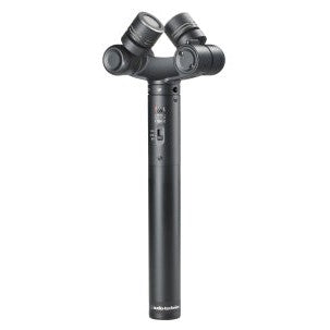 The AT2022 is a condenser microphone designed for stereo recording. Two unidirectional condenser capsules in an X/Y configuration pivot to allow for narrow (90°) or wide (120°) stereo operation. The capsules also fold flat for storage and transportation. Designed for general stereo recording and field sound capture, the AT2022 provides the spatial impact and realism of a live sound field. The microphone comes equipped with a stand clamp, AA battery, fuzzy windscreen and .5 m cable that terminates in a 3.5 mm stereo plug.
