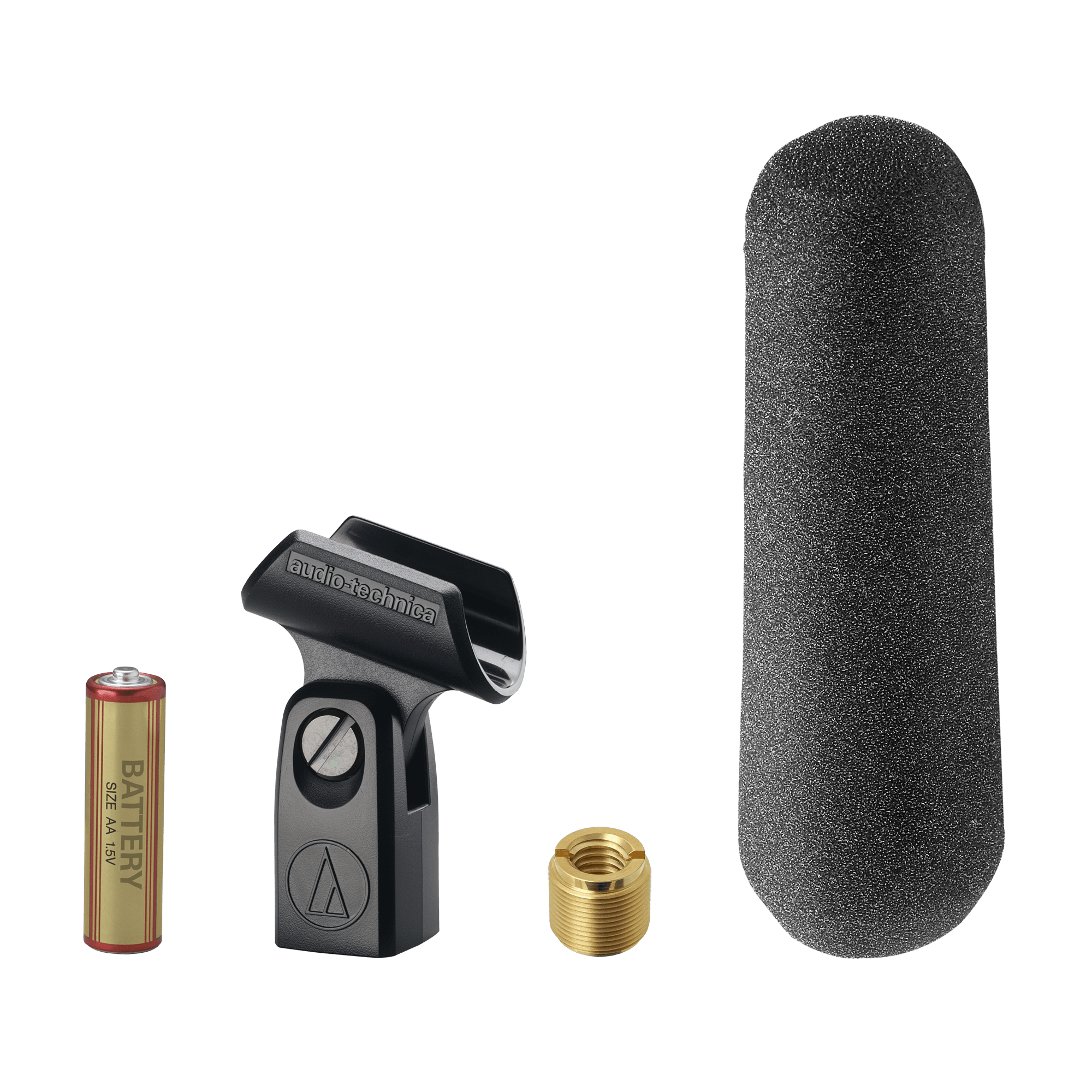 Accessories Included: AT8405a stand clamp for 5/8"-27 threaded stands; AT8134 windscreen; battery; 5/8"-27 to 3/8"-16 threaded adapter; protective carrying case