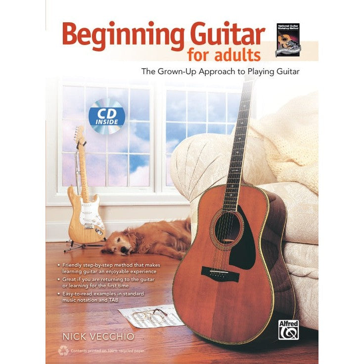 This fun, friendly, step-by-step introduction to guitar is written with the adult learner in mind. It is both a great self-help book and a great method for use with a teacher. Learning how to play chords, melodies, and strums is made simple with easy-to-read examples in standard music notation and TAB. Large diagrams and photographs of the hands simply the learning process even further. A CD demonstrating all of the examples is included.