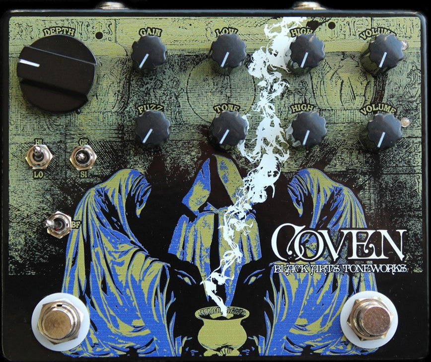The Black Arts Coven takes two very useful circuits and combines them into one unit, saving space, cabling and powering. The Pharaoh and Black Forest are here in their entirety with the addition of a toggle to switch the order of the effects. Pharaoh into Black Forest or Black Forest into Pharaoh at the flick of a switch. A hugely useful tone-shaping tool, the Coven is the joining of two forces to create a new unified path. This pedal operates on a standard 9 V DC power supply. No battery connection.