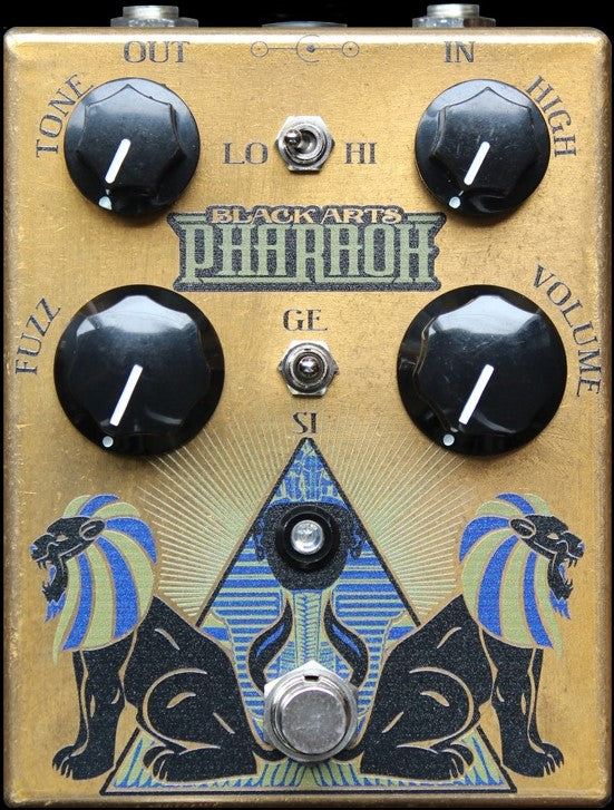The Pharaoh starts with a hi/lo input switch, not unlike that of your favorite tube amp. Lo for more headroom / less clipping. Hi for less headroom / more clipping. A standard fuzz knob. A full range tone control with the addition of a high-end compensation knob to allow you to replenish the highs cut by the tone control when boosting lows. The diode selector switch allows for different modes of clipping. Silicon Diodes for a raspy distorted sound, Diodes out for more volume/headroom and less clipping. Asymmetrical Germanium clipping diodes give a warm, tubey old-school sound.