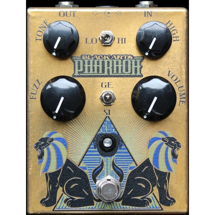 The Pharaoh starts with a hi/lo input switch, not unlike that of your favorite tube amp. Lo for more headroom / less clipping. Hi for less headroom / more clipping. A standard fuzz knob. A full range tone control with the addition of a high-end compensation knob to allow you to replenish the highs cut by the tone control when boosting lows. The diode selector switch allows for different modes of clipping. Silicon Diodes for a raspy distorted sound, Diodes out for more volume/headroom and less clipping. Asymmetrical Germanium clipping diodes give a warm, tubey old-school sound.