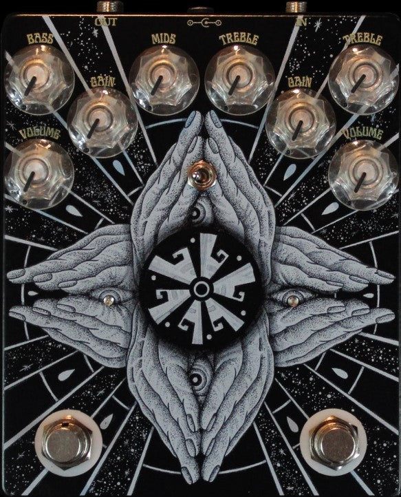 Some time ago, Black Arts worked with Mike Scheidt from YOB to design a distortion pedal which addressed the shortcomings of his favorite distortion at that time, the Ross Distortion. We used his pedal as a starting point and by adding a three-band active EQ between gainstages among other tweaks we achieved the desired tonality, aggression and volume boosting capabilities needed to push amps and address EQ needs of changing rooms on tour. The active EQ can control low / mid / treble but being between gain stages it can boost those frequencies into more or less distortion as needed. Low gain settings were of great importance to us and we were able to dial in clarity and articulation to make it a useful toneshaper in both live and studio applications. Mike road-tested the design and it was released as the Quantum Mystic OD. It was used on the 2014 YOB album "Clearing the Path to Ascend".