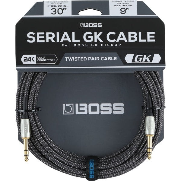 Serial GK cable with straight 1/4-inch TRS connectors, 30 ft./9m length. The BGK cable series delivers optimum performance with BOSS guitar synthesizer products that support the Serial GK digital interface, including the GK-5/GK-5B pickups and GM-800 module. Premium BOSS construction features include braided shielding, 24K gold-plated connectors, and a woven outer jacket for tangle-free use.