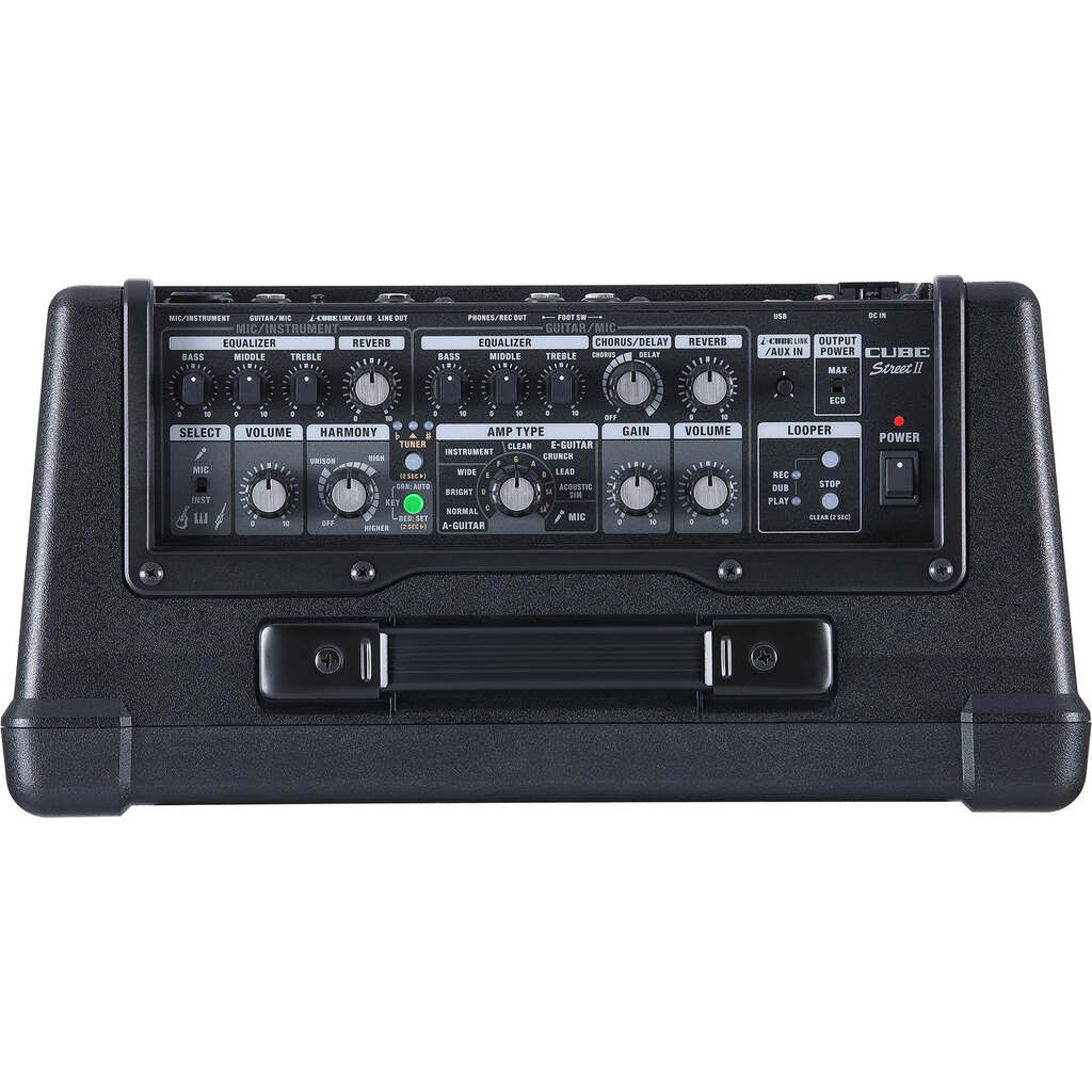 CUBE Street II is packed with features to enhance your sound and bring fresh energy to shows. Each channel provides dedicated three-band EQ and reverb, and there’s a chorus/delay effect on the Guitar/Mic channel. The harmony function on the Mic/Instrument channel creates impressive vocal harmonies that will make audiences wonder where the background singers are hiding. Harmonies are produced as you sing based on the guitar chords you play or a key you set, and you can bring them in and out as needed with an optional footswitch. There’s a built-in looper too, providing a powerful and fun way to create backing tracks on the spot.