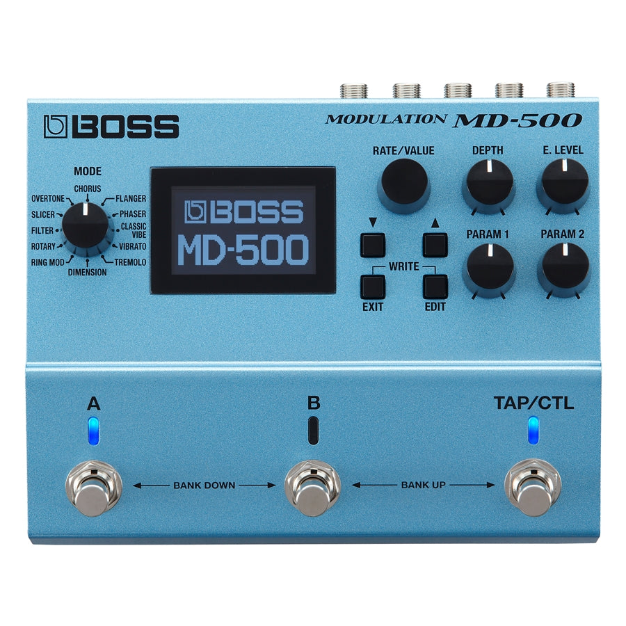 Monster Mod Machine Twelve Modes and 28 Mod Effect Types Prime Tone Extraordinary Sound Advanced Interface, Intuitive Operation A/B Simul Mode and Insert Loop Function Intensive Real-Time Control Studio-level sound with first-in-class 32-bit AD/DA, 32-bit floating point processing, and 96 kHz sampling rate 12 modes and 28 modulation types, all with deep editing parameters Classic mod effects and BOSS originals, newly enhanced with cutting-edge technology A/B Simul mode for using two patches at once, with your choice of series/parallel connection and mixed or split A/B output Insert Loop function allows you to use mod effects before, after, or around drive pedals Graphic LCD and intensive real-time control options 297 onboard patch memories and hands-on controls Selectable buffered-bypass or true-bypass operation MIDI I/O for interfacing with MIDI control devices USB-MIDI for connecting to the MD-500 Editor/Librarian or a DAW Runs on four AA-size batteries or PSA-series AC adapter MD-500 Modes and Algorithms Chorus—Four types: Prime, CE-1 Chorus, CE-1 Vibrato, and TRI-CHO. Flanger—Two types: Prime G (for guitar) and Prime B (for bass). Phaser— Three types: Prime G (for guitar), Prime B (for bass), and Script. Classic Vibe—Two types: Chorus (mixed output) and Vibrato (effect-only output). Vibrato—Two types: Prime and Scanner (tonewheel organ-style vibrato). Tremolo—Four types: Prime T and Prime P, plus Twin and Deluxe amp-style tremolo. Dimension—Models the legendary Roland SDD-320 Dimension D rack unit; includes the original four sound modes and an all-new fifth mode, plus a user setting for saving any combination of modes. Ring Mod—Classic ring modulation effects, plus Intelligent mode for enhanced clarity when playing scales. Rotary—Vintage rotating speaker effect with slow and fast speeds. Filter—Auto wah and touch wah (with independent types optimized for guitar and bass), plus pattern filter type. Slicer—Original BOSS effect derived from the popular SL-20 Slicer, with programmable options not available in the SL-20 pedal. Overtone—Original BOSS effect based on the MO-2 Multi Overtone pedal; uses MDP tech to alter the input signal’s pitch and harmonic characteristics, allowing you to create unique new sound textures.