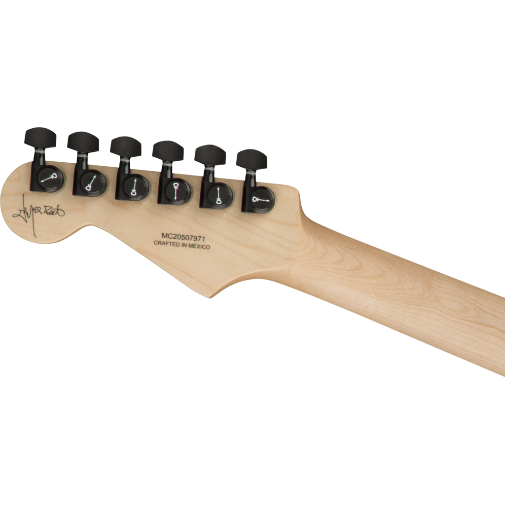 The Jim Root Signature Pro-Mod San Dimas® Style 1 HH FR E comes in a stark Satin White finish with all-black hardware including the three-way blade switch tip and skirted Strat®-style control knob. A Charvel multi-fit hardshell gig bag is also included.