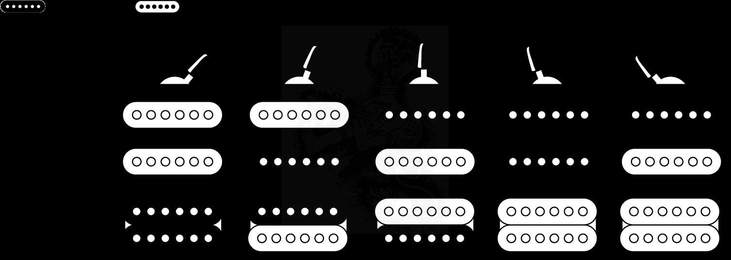 Pickup Switching: 5-Position Blade: Position 1. Full Bridge Pickup, Position 2. Bridge Inner Coil and Middle Pickup, Position 3. Bridge Outer Coil and Neck Pickup, Position 4. Middle and Neck Pickup, Position 5. Full Neck Pickup