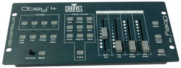 It’s a compact DMX controller for LED wash lights with 3- or 4-channel modes—red, green, blue and white/amber—for easy color-mixing control. It has built-in automated, sound-activated or manual playback options and can control fixtures in four different zones—independently of each other. Its one-touch buttons of pre-mixed colors, built-in chases and strobe and dimmer controls make it perfect for a lighting novice or anyone looking for an easy way to control LED washes.