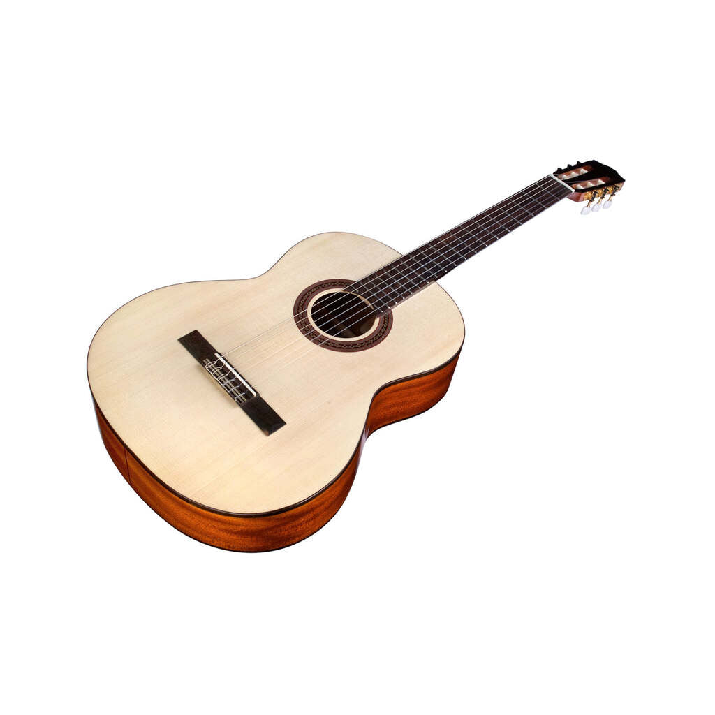 Based on Córdoba's flagship C5, the C5 Spruce adds a new option to a fan favorite. Perfect as a first nylon-string guitar, this lightweight model is built with a solid Engelmann spruce top and mahogany back and sides to produce a clear, powerful tone with beautiful sustain. Handmade in the traditional Spanish style, the C5's carved headstock, hand-inlaid wood rosette, Pau Ferro binding, Savarez strings, and glossy PU finish result in a guitar that truly stands out from all other entry-level options. A lightweight adjustable truss rod is built into the neck for stability. Available in Natural finish with solid Engelmann Spruce top.