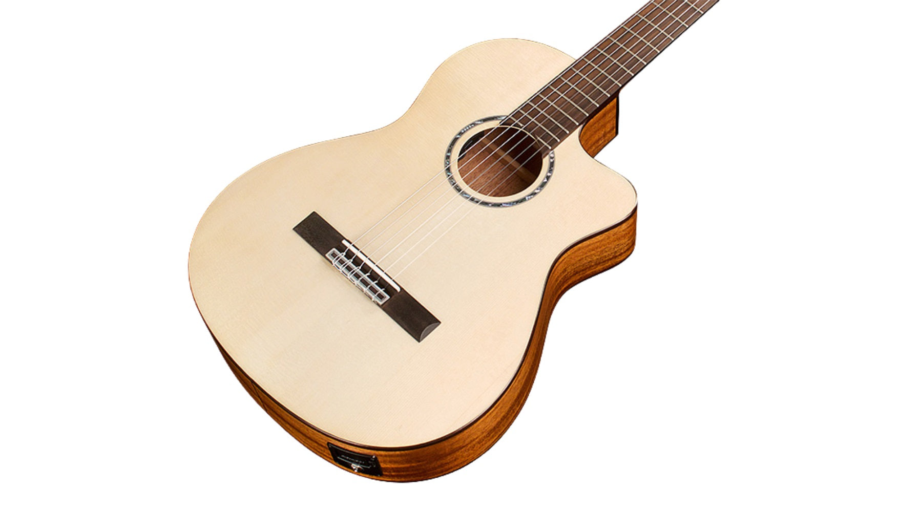 Córdoba’s entry into the fusion line! The perfect choice to transition from a steel string to a nylon guitar, the Córdoba Fusion 5 features a solid spruce top, mahogany back and sides, a full body with cutaway for extended playing range, side dot fret position markers, and a pearl decal rosette and arches. The fusion neck with a 16” radius fretboard and smaller, 1 7/8” (48mm) nut width provides a playing experience very close to that of a steel string guitar. This familiarity offers an easy transition for steel string players and players with smaller hands to the world of nylon string guitar. Added side dot markers also depart from traditional nylon string guitar construction, providing players reference for their position on the fretboard. Equipped with the Fishman Sonitone Pickup System, the Fusion 5 is ready to plug in and play. Available in Gloss Natural and Jet-Black finish with mahogany back and sides and Gloss Sonata Burst with elegant flamed mahogany back and sides.
