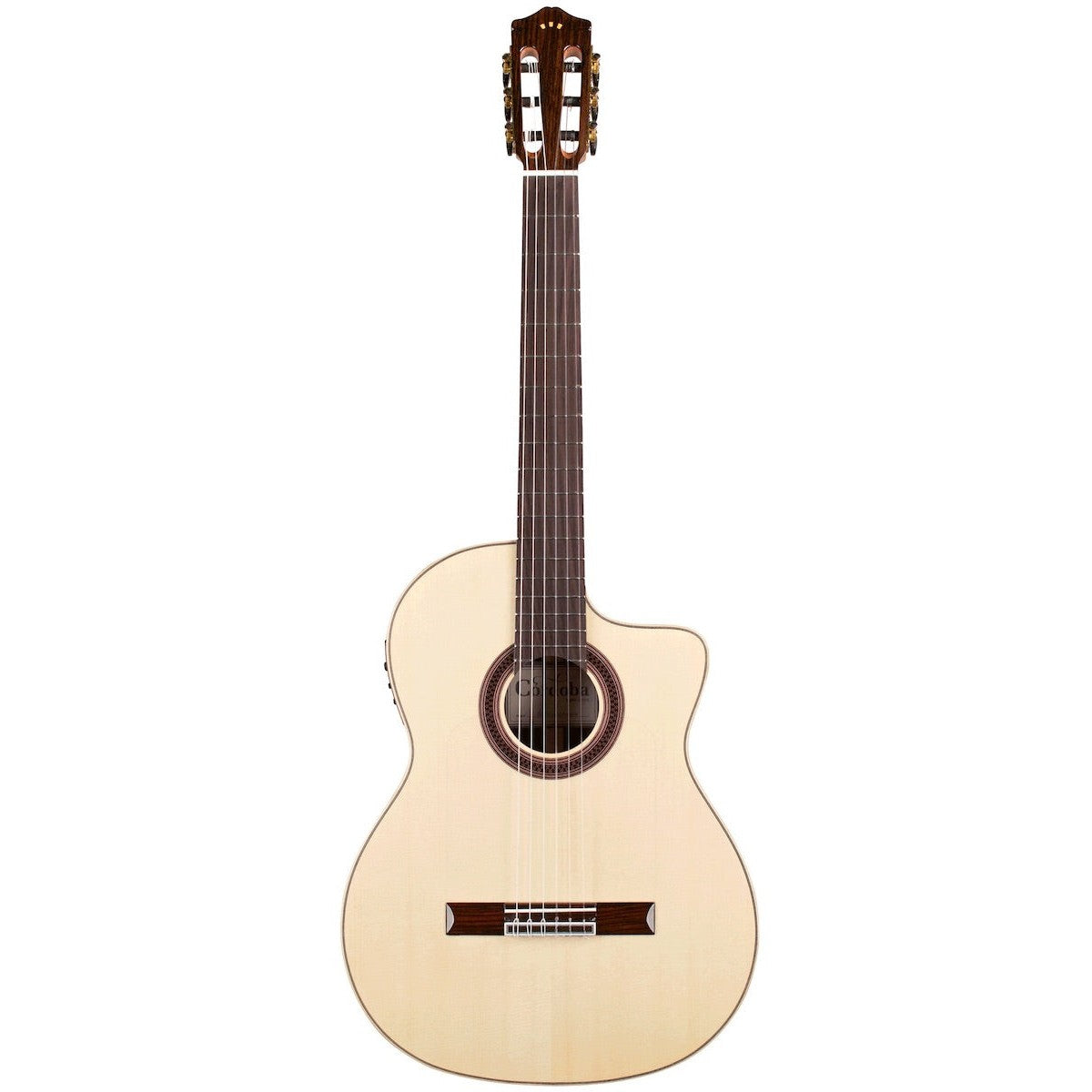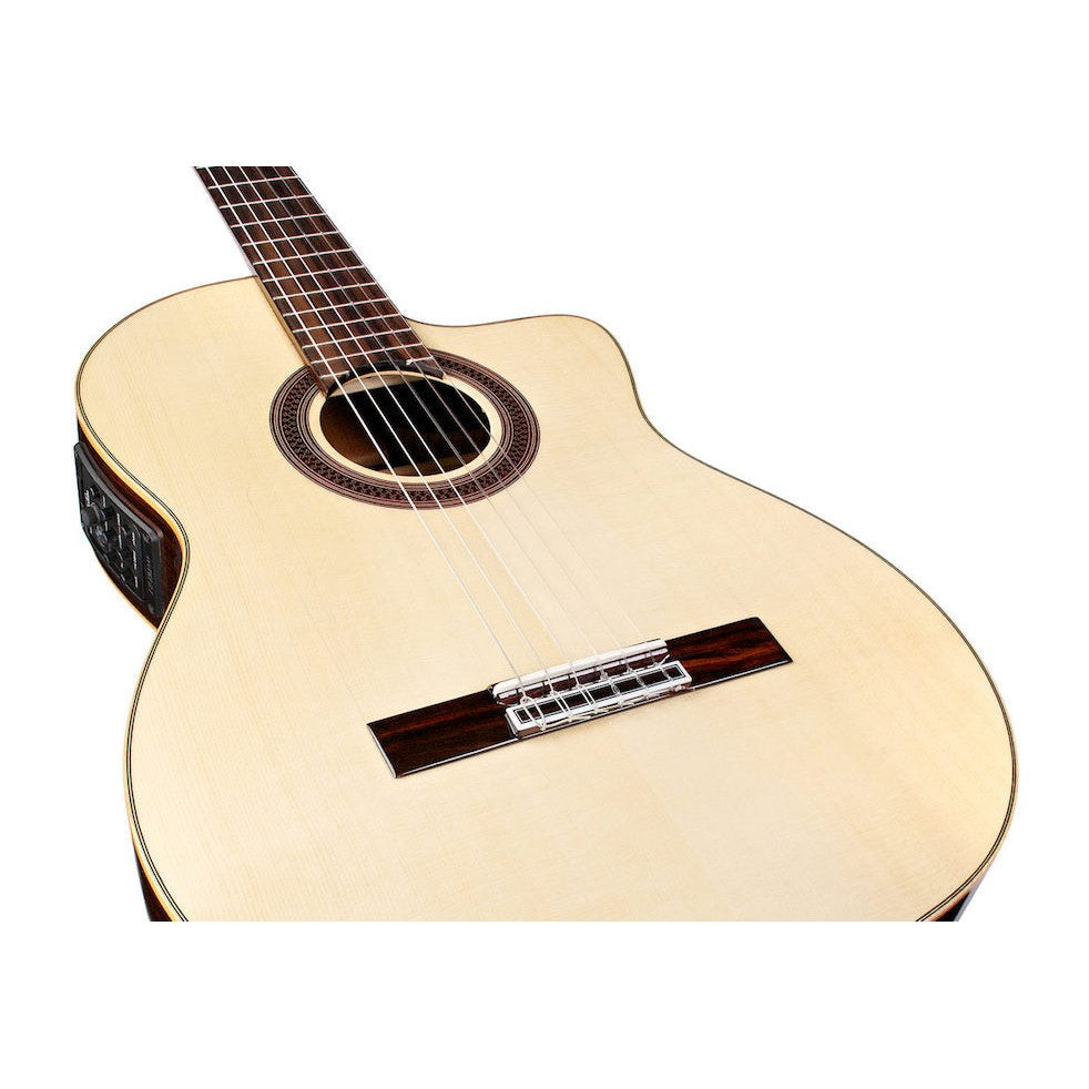 Built with a solid European spruce top, cypress back and sides, soft cutaway and Fishman Presys Blend preamp, the GK Studio is the ultimate gigging instrument and a Córdoba best seller. Made for the stage, the GK Studio is constructed with a slightly thinner body depth, neck, and nut width than a traditional Spanish guitar. The neck is designed to have little or no relief, offering low action for ease of comfort and quick playability. Flamenco players will love its bright, snappy tone designed to cut through a noisy venue. However, any guitarist looking for a new tone will feel right at home. Like every Córdoba guitar, this model has a two-way truss rod built into the neck. Other premium features include a high gloss finish, clear flamenco-style tap plate, and Savarez strings.