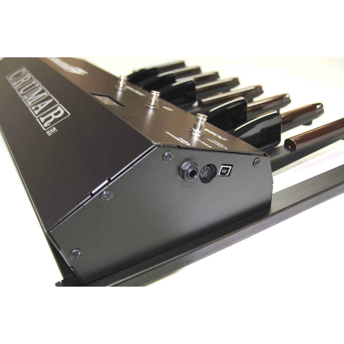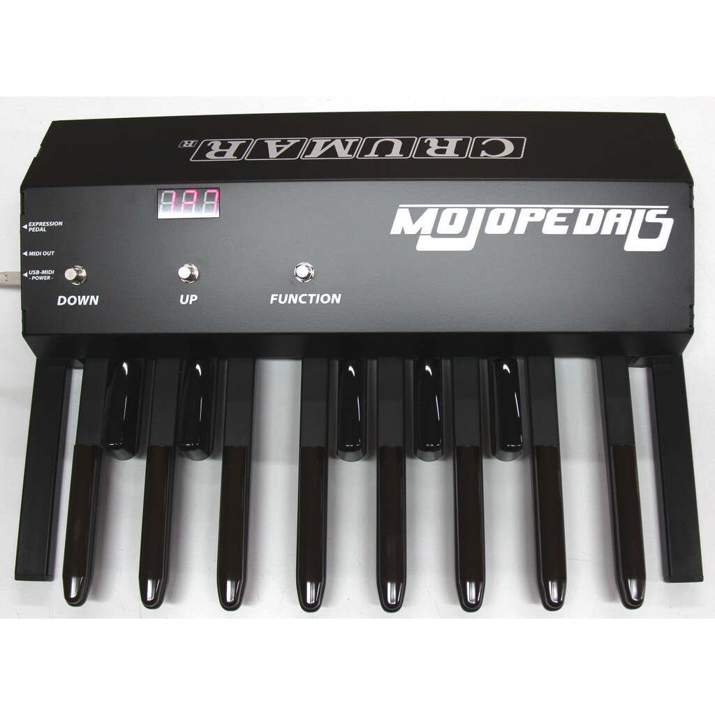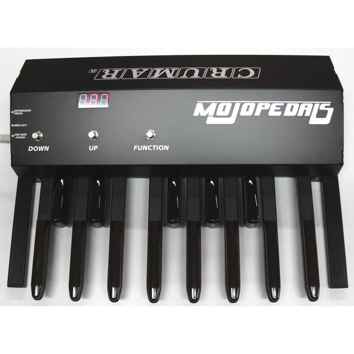 Crumar MojoPedals is a 13 note MIDI pedalboard conceived to complement the Mojo organ but can also be used as a generic MIDI pedalboard to be connected to any MIDI capable equipment. High quality metal pedals offer superior control over the playbility of the instrument: you can now expand your organ setup with this modern, lightweight accessory which offers basic but very useful functions. It is possible to select the MIDI channel, transpose by octaves or by semitones at the push of a button, send MIDI Program Change events and use the "Rotary" function to control the Rotary Simulation of the Mojo thus eliminating the need of a separate footswitch. Three LEDs visualize the current settings and the state of the Rotary control by blinking slowly or rapidly according to the current speed. A TRS connector on the rear accepts a continuous control pedal that will send MIDI Control Change number 7, useful to control the digital volume of MIDI instruments. MojoPedals, thanks to its MIDI connectivity, is compatible with virtually every existing organ, keyboard, expander or any other MIDI device. The pedals are also capable of responding to velocity in order to add a further level of expressivity. Every MojoPedals comes with a free hard case. MojoPedals Specifications: 13 note MIDI pedalboard with velocity 2 switches for value decrease/increase or for rotary speed (run/stop, slow/fast) 1 menu switch for settings or for velocity on/off: 5 options available visualized by 5 leds MIDI channel selection (from 1 to 16) Program change mode Octave selection (one down and one up) Transpose +/- 12 semitones Rotary speed function. 3 status LEDs: value down, default value, value up or run/stop, slow/fast when in rotary mode. On/off switch Connections: MIDI input MIDI output Power in 5V DC 500 mA Volume pedal compatible with pedals based on a 10 Kohm potentiometer. Other: Dimensions 57x44x15 cm Hard case dimensions 60x47x18