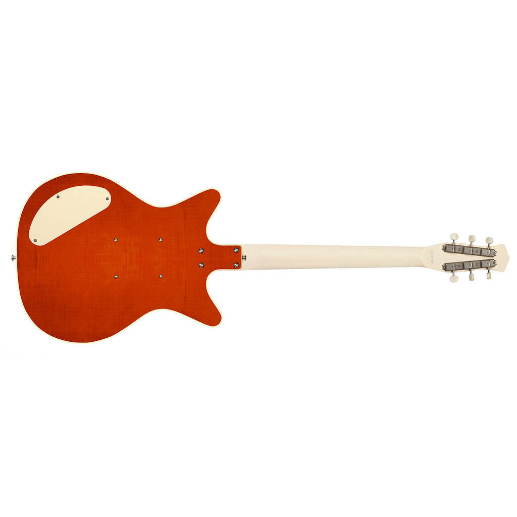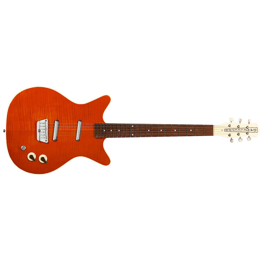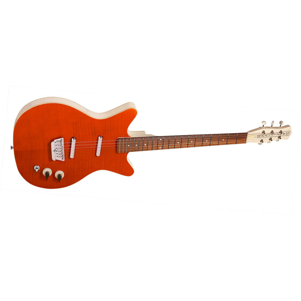 Open the pearly gates! Danelectro launched this in 1959, naming it the “Deluxe”. A huge understatement! This hot reissue features our Vintage 50’s Lipstick Pickups, adjustable bridge, front and back binding, pointer knobs, and Gotoh vintage 15:1 tuners. Flame Maple top and back,
