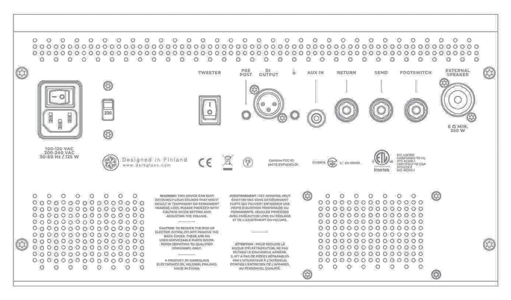 - AC Socket: Use this connector to feed electric power to the amplifier. 100–230 VAC, 50-60 Hz. Set the voltage selector switch to the correct position before turning on the amplifier!