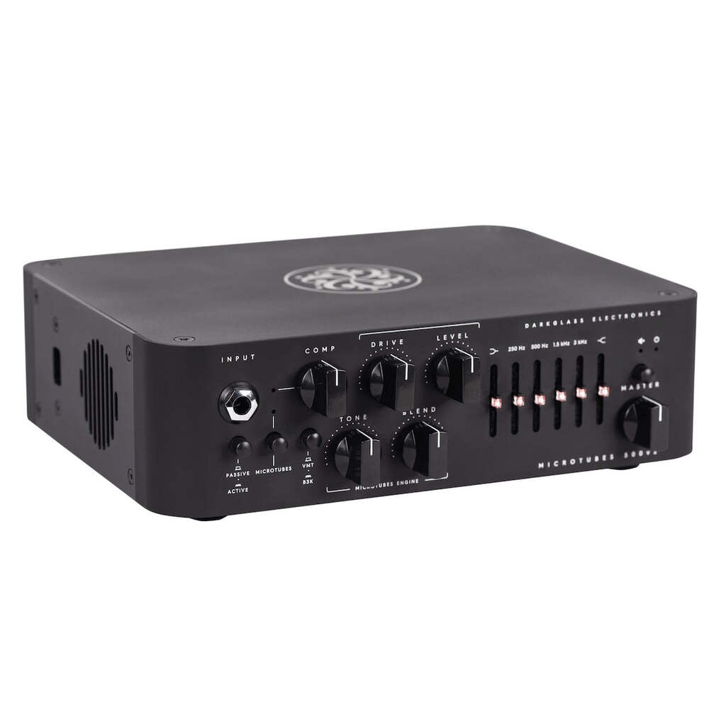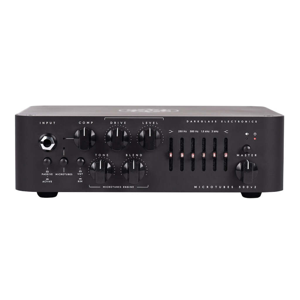 The Microtubes 500v2 is a 500W amplifier equipped with an all-analog preamplifier, custom-designed Darkglass high-efficiency class D Module, an ultra-quiet graphic equalizer, and a digital impulse-response cabinet emulator for DI outputs or headphones.