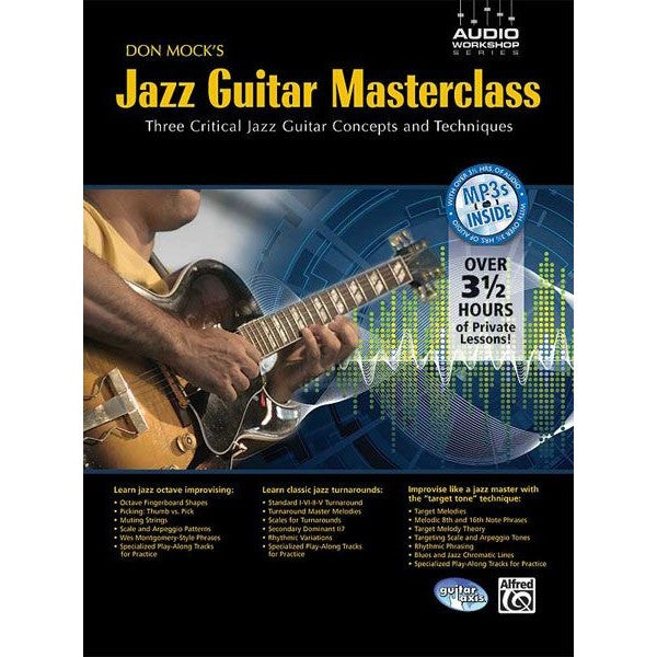 This amazing three-section set of personal lessons with jazz guitar guru Don Mock features hours of personal audio instruction, play-along tracks, and demonstrations, with a complete accompanying book of music examples, exercises, and transcriptions in notation and TAB Section 1 covers the all-important, Wes Montgomery-inspired Octave Technique. Section 2 is devoted to the target tone concept, which simplifies the improvising process, enabling you to play sophisticated lines that resolve beautifully into the correct chord tones. Section 3 is devoted to turnarounds: short four-chord progressions often found at the end of tunes to setup and return to the beginning.